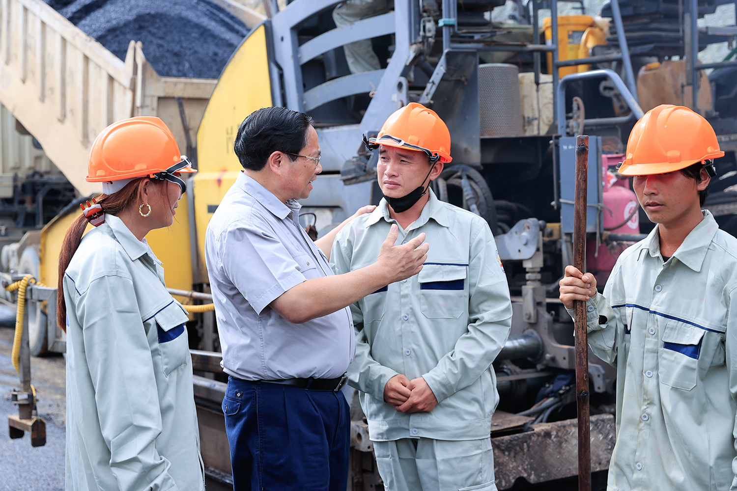 Ủy viên Bộ Chính trị, Thủ tướng Chính phủ Phạm Minh Chính thăm hỏi, động viên công nhân, người lao động trên công trường tuyến đường Đông - Tây, tỉnh Ninh Bình _Nguồn: chinhphu.vn