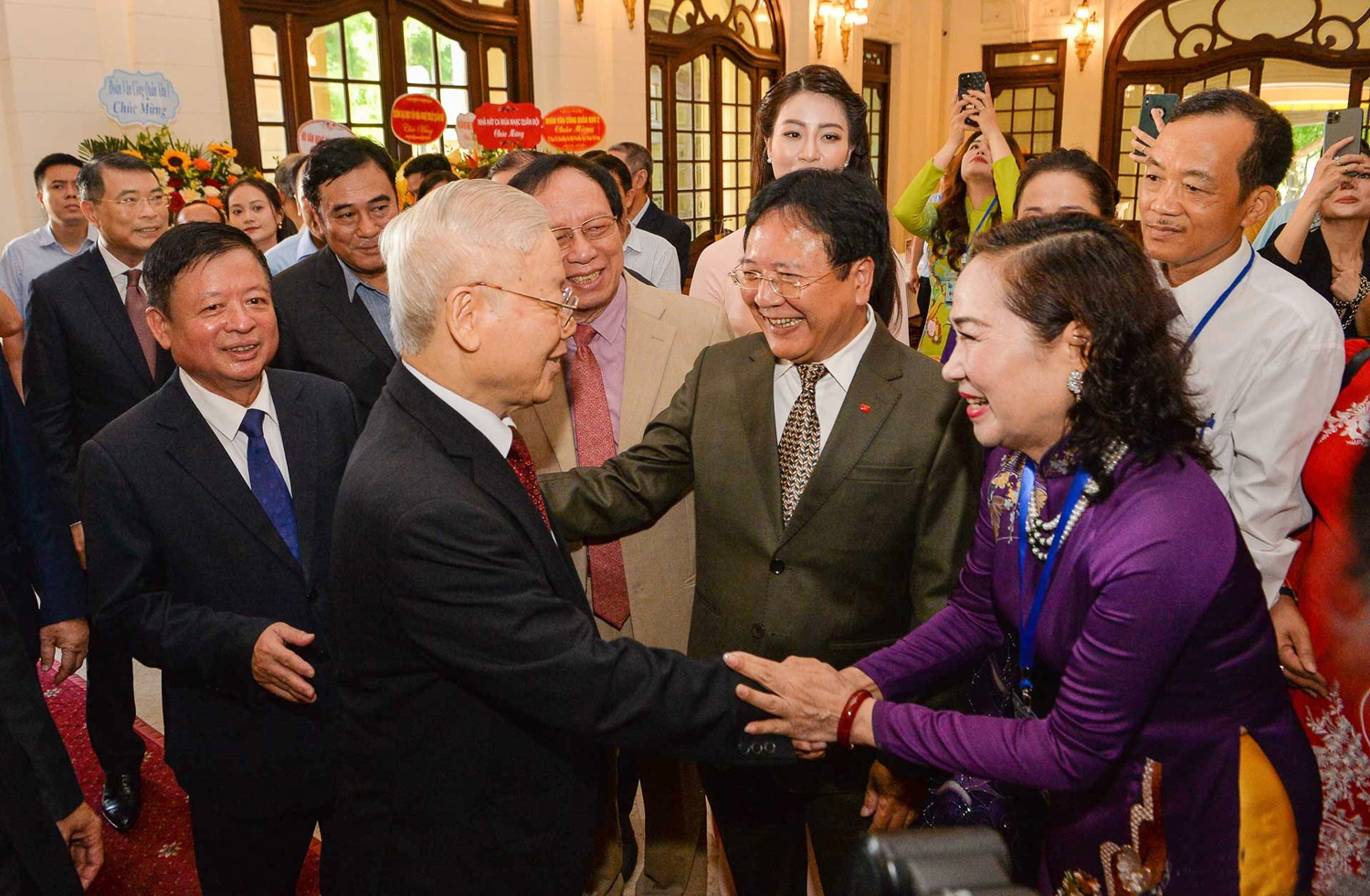 Tổng Bí thư Nguyễn Phú Trọng với các đại biểu dự Lễ kỷ niệm 75 năm Ngày thành lập Liên hiệp các Hội Văn học nghệ thuật Việt Nam _Nguồn: nhiepanhdoisong.vn