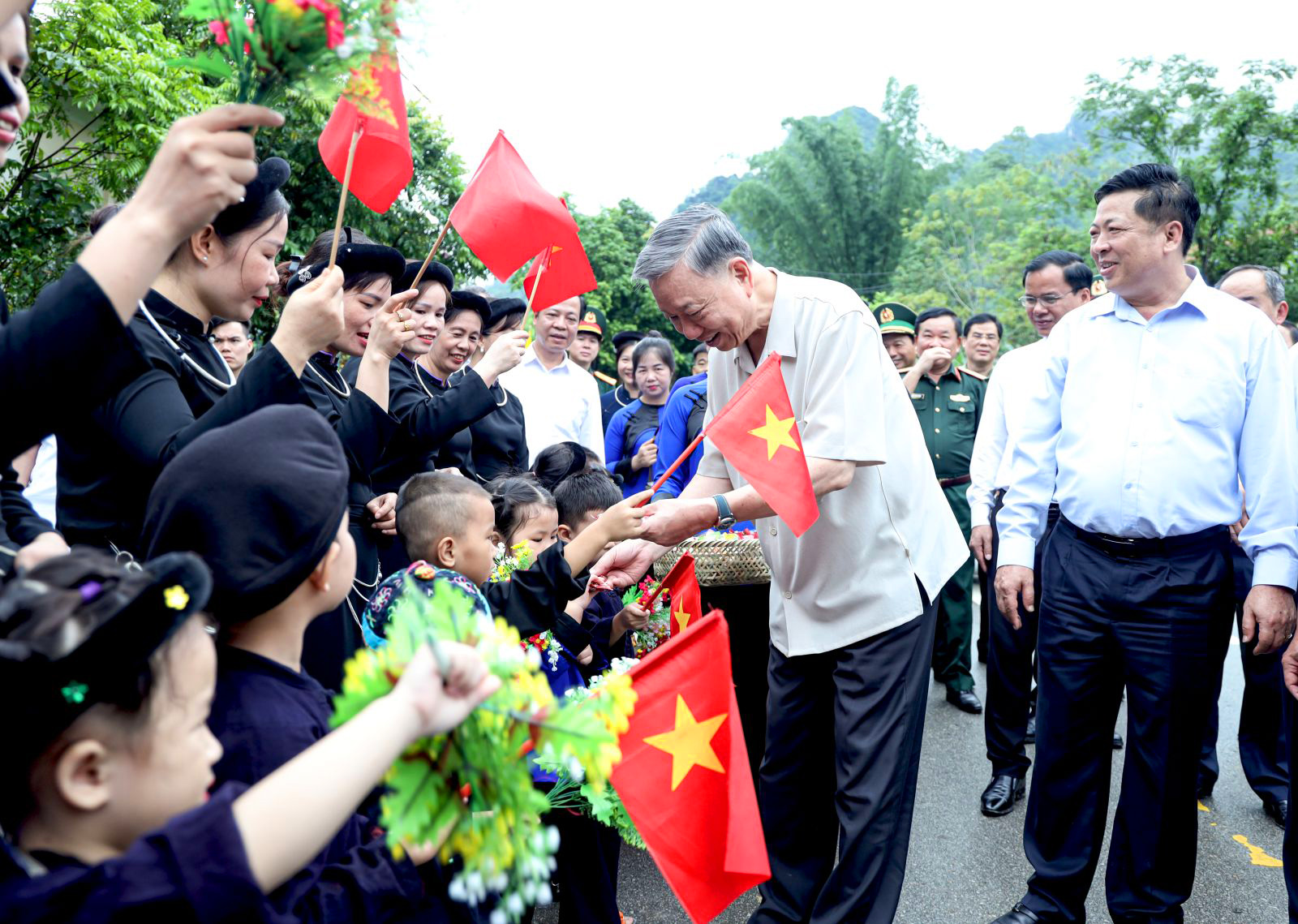 Ủy viên Bộ Chính trị, Chủ tịch nước Tô Lâm với thiếu nhi xã Trường Hà, huyện Hà Quảng, tỉnh Cao Bằng, ngày 10-6-2024 _Nguồn: vpctn.gov.vn