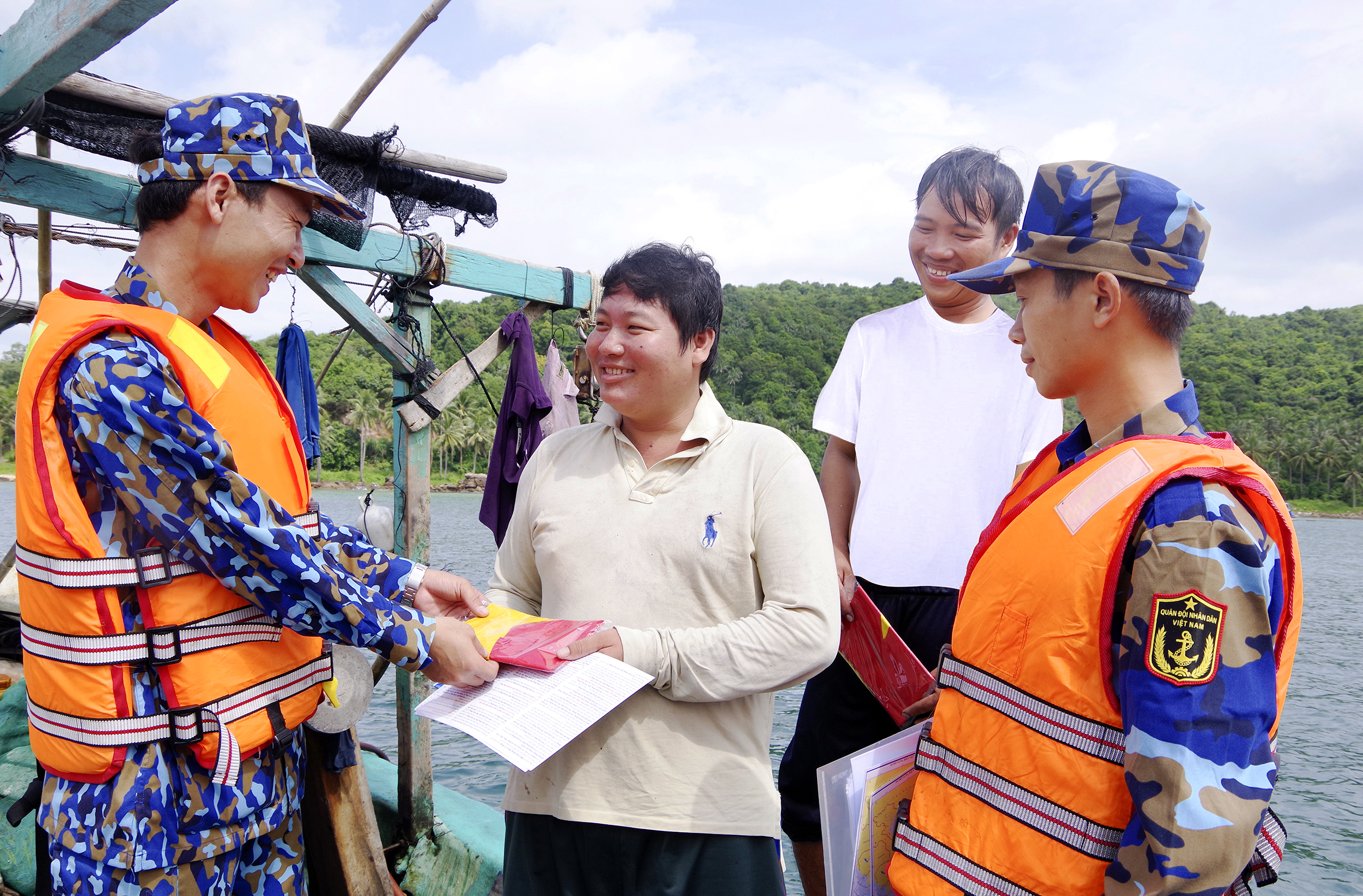 Cán bộ, chiến sĩ Vùng 5 Hải quân tuyên truyền pháp luật và tặng cờ Tổ quốc cho ngư dân vươn khơi, bám biển baohaiquanvietnam.vn