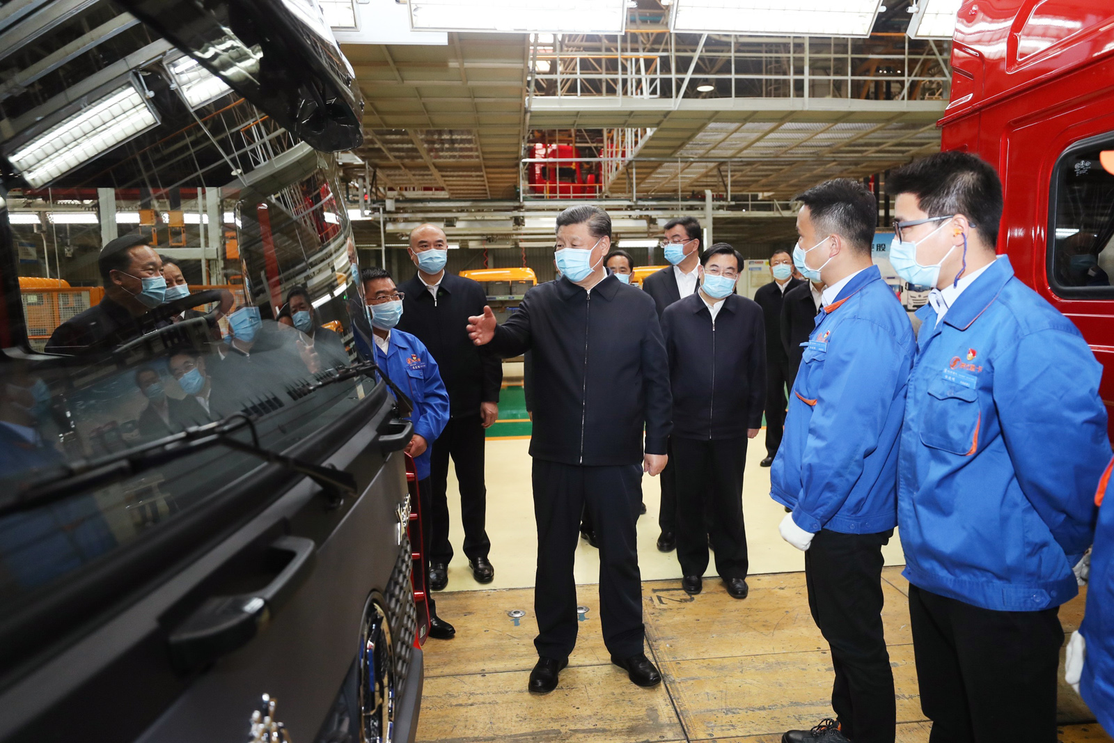 Tổng Bí thư, Chủ tịch Trung Quốc Tập Cận Bình (giữa, phía trước) thăm Tập đoàn sản xuất ô tô Thiểm Tây (Trung Quốc), ngày 22-4-2020 _Ảnh: THX/TTXVN