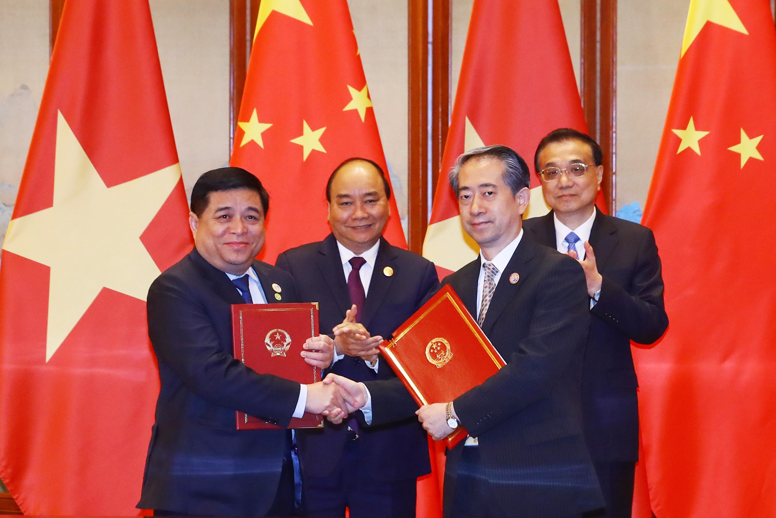 Ủy viên Bộ Chính trị, Thủ tướng Chính phủ Nguyễn Xuân Phúc cùng Thủ tướng Trung Quốc Lý Khắc Cường chứng kiến Lễ ký kết các văn kiện hợp tác giữa hai nước tại Thủ đô Bắc Kinh (Trung Quốc), năm 2019 _Ảnh: TTXVN