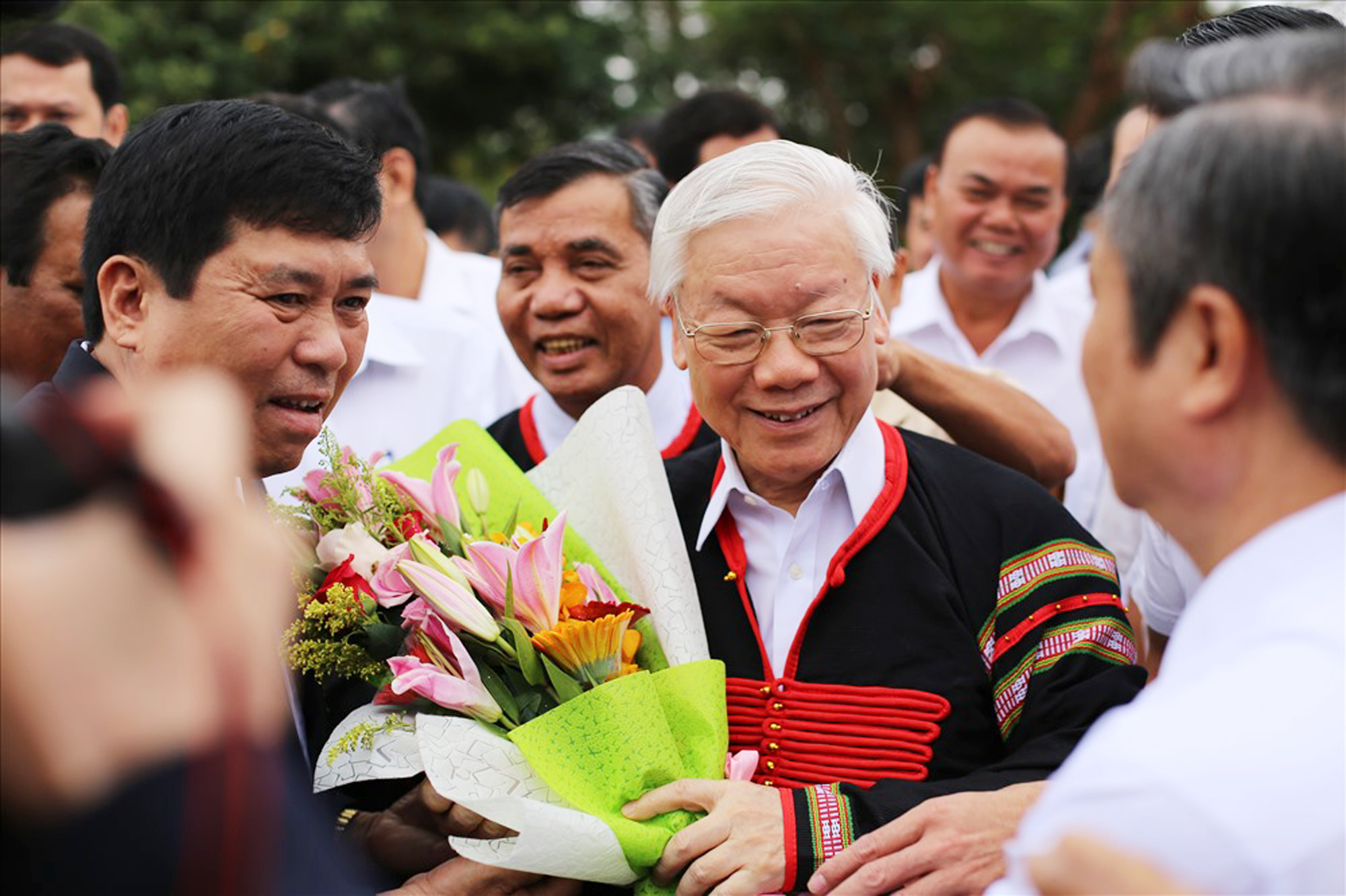 Vấn đề đại đoàn kết dân tộc giữ vai trò vô cùng quan trọng trong quá trình phát triển của nước ta (Trong ảnh: Tổng Bí thư, Chủ tịch nước Nguyễn Phú Trọng dự Ngày hội Đại đoàn kết toàn dân tộc tại xã Dur Kmăl, huyện Krông Ana, tỉnh Đắk Lắk) _Ảnh: tư liệu