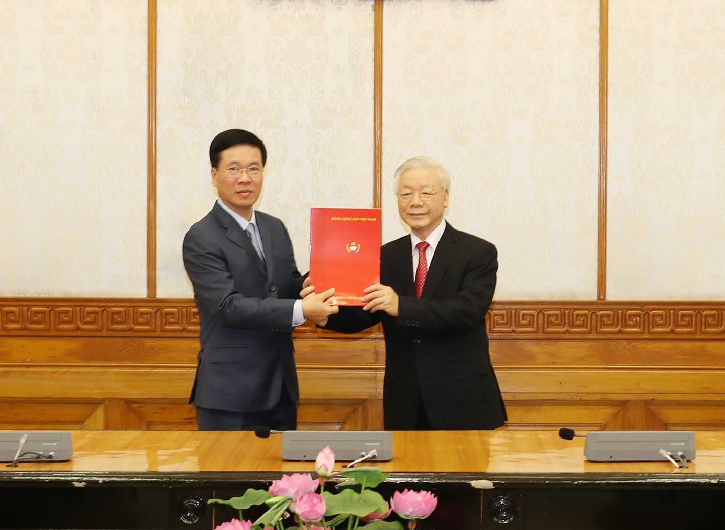 Tổng Bí thư, Chủ tịch nước Nguyễn Phú Trọng trao Quyết định cho đồng chí Võ Văn Thưởng, Ủy viên Bộ Chính trị được phân công giữ chức Thường trực Ban Bí thư_Ảnh: TTXVN