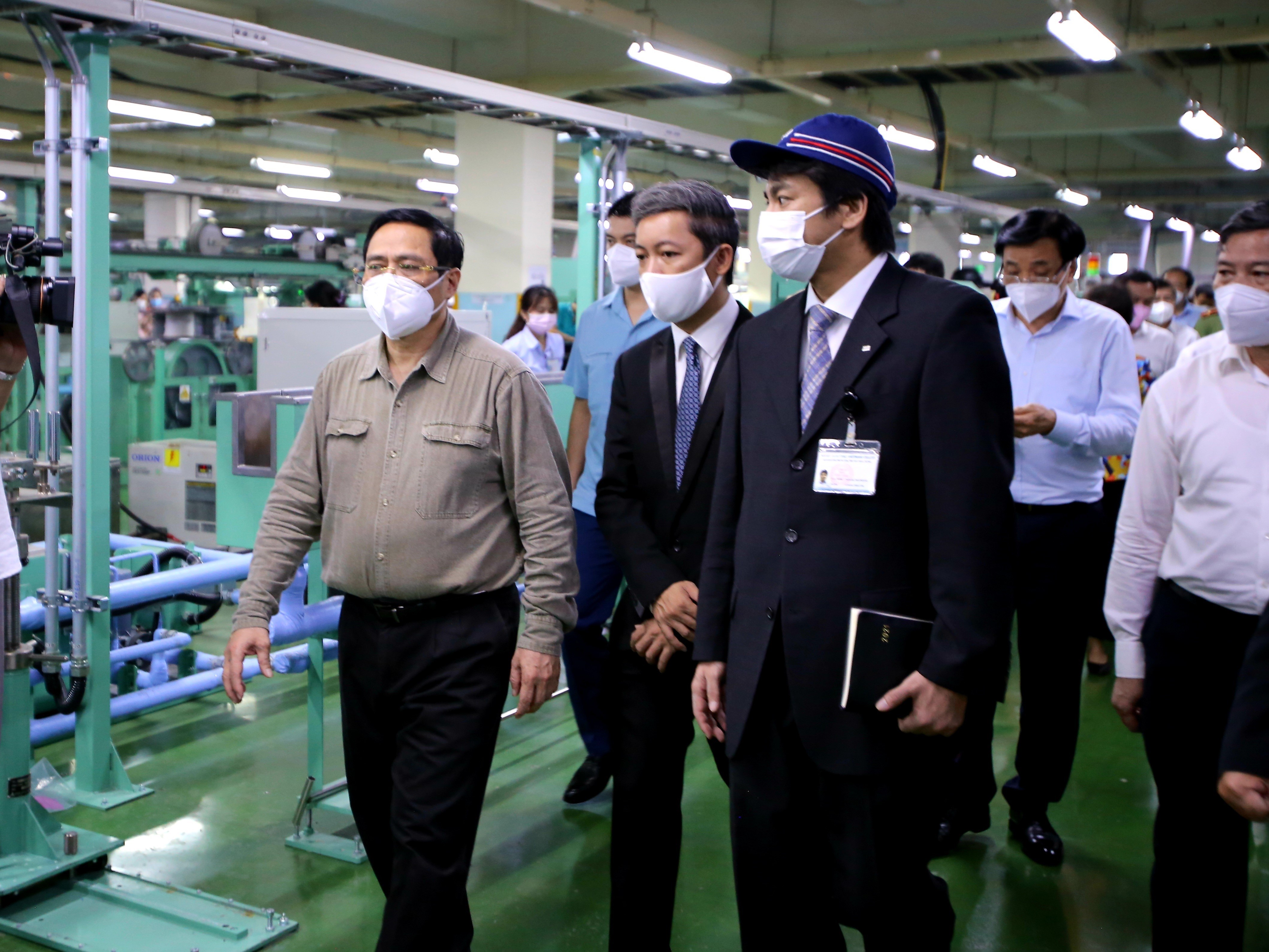 Ủy viên Bộ Chính trị, Thủ tướng Chính phủ Phạm Minh Chính kiểm tra công tác phòng, chống dịch COVID-19 và thăm hỏi, động viên công nhân làm việc tại Công ty Nissei Electric Vietnam (ở Khu chế xuất Linh Trung 1, thành phố Thủ Đức)_Ảnh: TTXVN