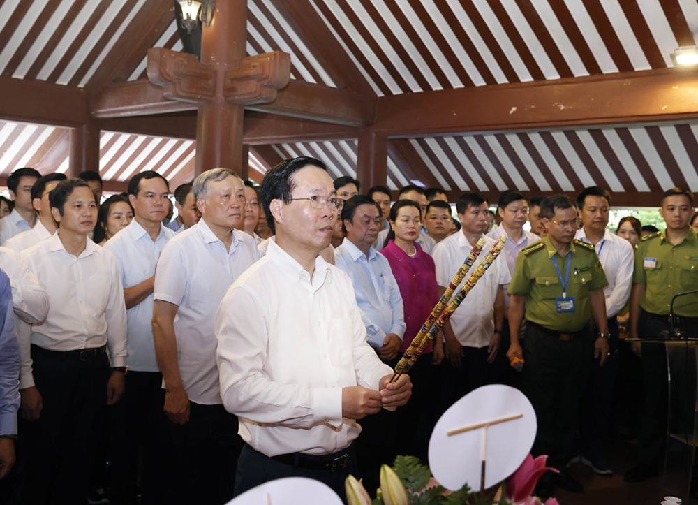 TCCS - Nhân kỷ niệm 78 năm Cách mạng Tháng Tám và Quốc khánh 2-9, 54 năm Ngày mất của Chủ tịch Hồ Chí Minh và 54 năm thực hiện Di chúc thiêng liêng của Người, ngày 27-8-2023, Ủy viên Bộ Chính trị, Chủ tịch nước Võ Văn Thưởng chủ trì Lễ dâng hương tưởng nhớ Chủ tịch Hồ Chí Minh tại Đền thờ Chủ tịch Hồ Chí Minh trên Đỉnh Vua, núi Ba Vì (huyện Ba Vì, thành phố Hà Nội).