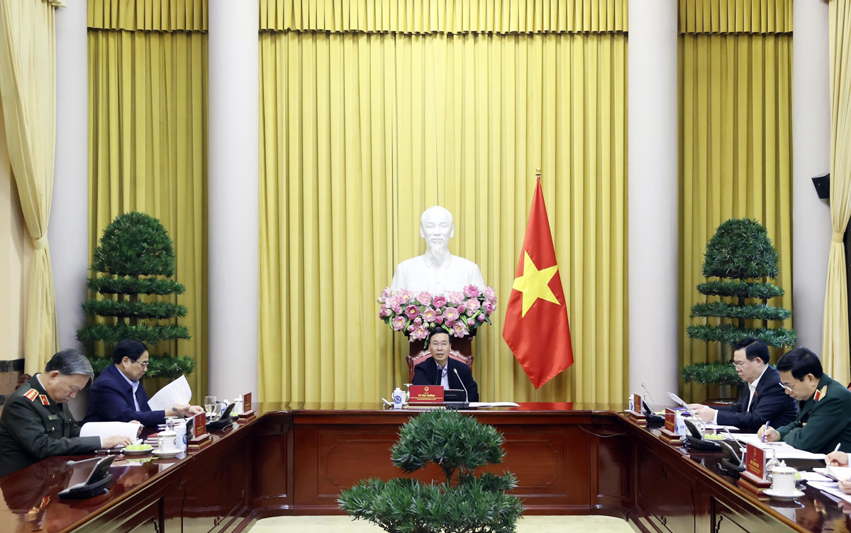 Chủ tịch nước Võ Văn Thưởng nhấn mạnh, thời gian tới, tiếp tục bám sát, theo dõi, chủ động nắm chắc, nghiên cứu, phân tích, đánh giá, dự báo sát tình hình thế giới, khu vực, trong nước, nhất là những vấn đề nổi lên, mang tính chiến lược tác động đến quốc phòng, an ninh của Việt Nam để kịp thời tham mưu với Đảng, Nhà nước các chủ trương, biện pháp xử lý, không để bị động, bất ngờ trong mọi tình huống; chú trọng bảo vệ nền tảng tư tưởng của Đảng, đấu tranh phản bác luận điệu xuyên tạc của các thế lực thù địch; tiếp tục phát huy truyền thống, sức mạnh đại đoàn kết toàn dân tộc trong sự nghiệp xây dựng và bảo vệ Tổ quốc. /.
