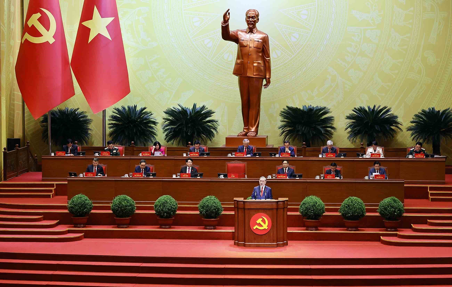 Tổng Bí thư Tô Lâm trình bày Báo cáo của Ban Chấp hành Trung ương Đảng khóa XIII về các văn kiện trình Đại hội XIV của Đảng _Ảnh: TTXVN