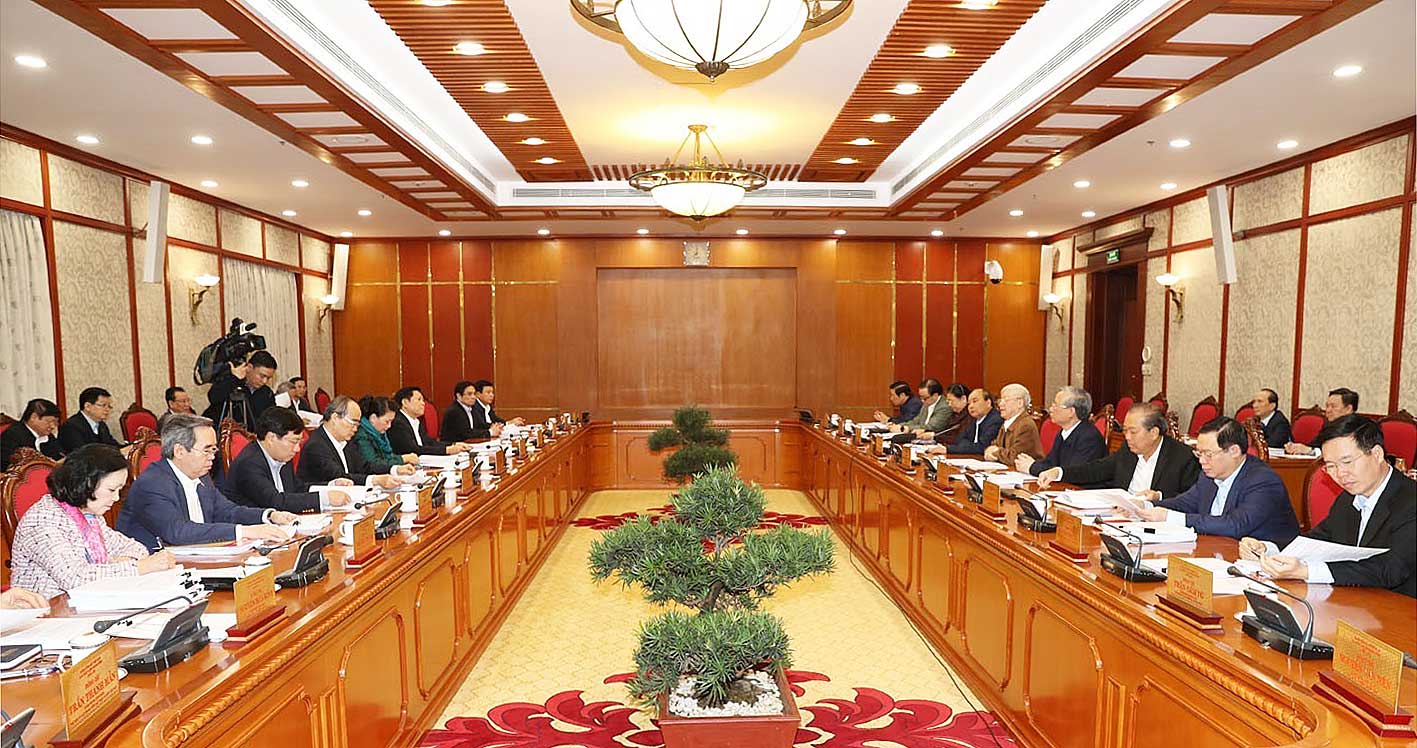 TCCS - Ngày 14-2-2020, tại Trụ sở Trung ương Đảng, Tổng Bí thư, Chủ tịch nước Nguyễn Phú Trọng đã chủ trì họp Bộ Chính trị cho ý kiến hoàn thiện dự thảo Văn kiện Đại hội XIII của Đảng, gửi đại hội đảng bộ cơ sở đóng góp ý kiến.
