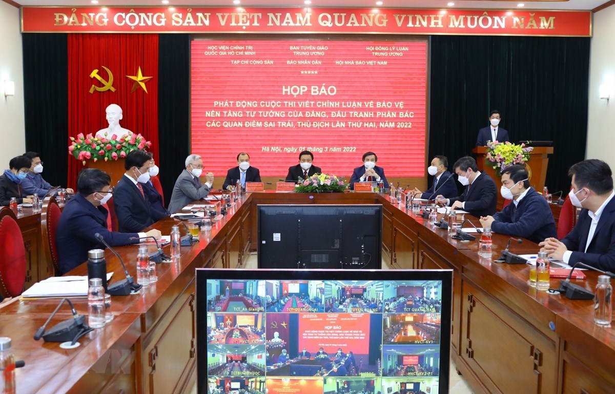 TCCS - Để tiếp tục đẩy mạnh việc thực hiện Nghị quyết số 35-NQ/TW ngày 22-10-2018 của Bộ Chính trị khóa XII về “Tăng cường bảo vệ nền tảng tư tưởng của Đảng, đấu tranh phản bác các quan điểm sai trái, thù địch trong tình hình mới”, đồng thời triển khai có hiệu quả Nghị quyết Đại hội XIII của Đảng, ngày 1-3-2022, tại Hà Nội, Học viện Chính trị quốc gia Hồ Chí Minh phối hợp Ban Tuyên giáo Trung ương, Hội đồng Lý luận Trung ương, Tạp chí Cộng sản, Báo Nhân dân và Hội Nhà báo Việt Nam tổ chức họp báo phát động Cuộc thi viết chính luận về bảo vệ nền tảng tư tưởng của Đảng, đấu tranh phản bác các quan điểm sai trái, thù địch lần thứ hai, năm 2022.