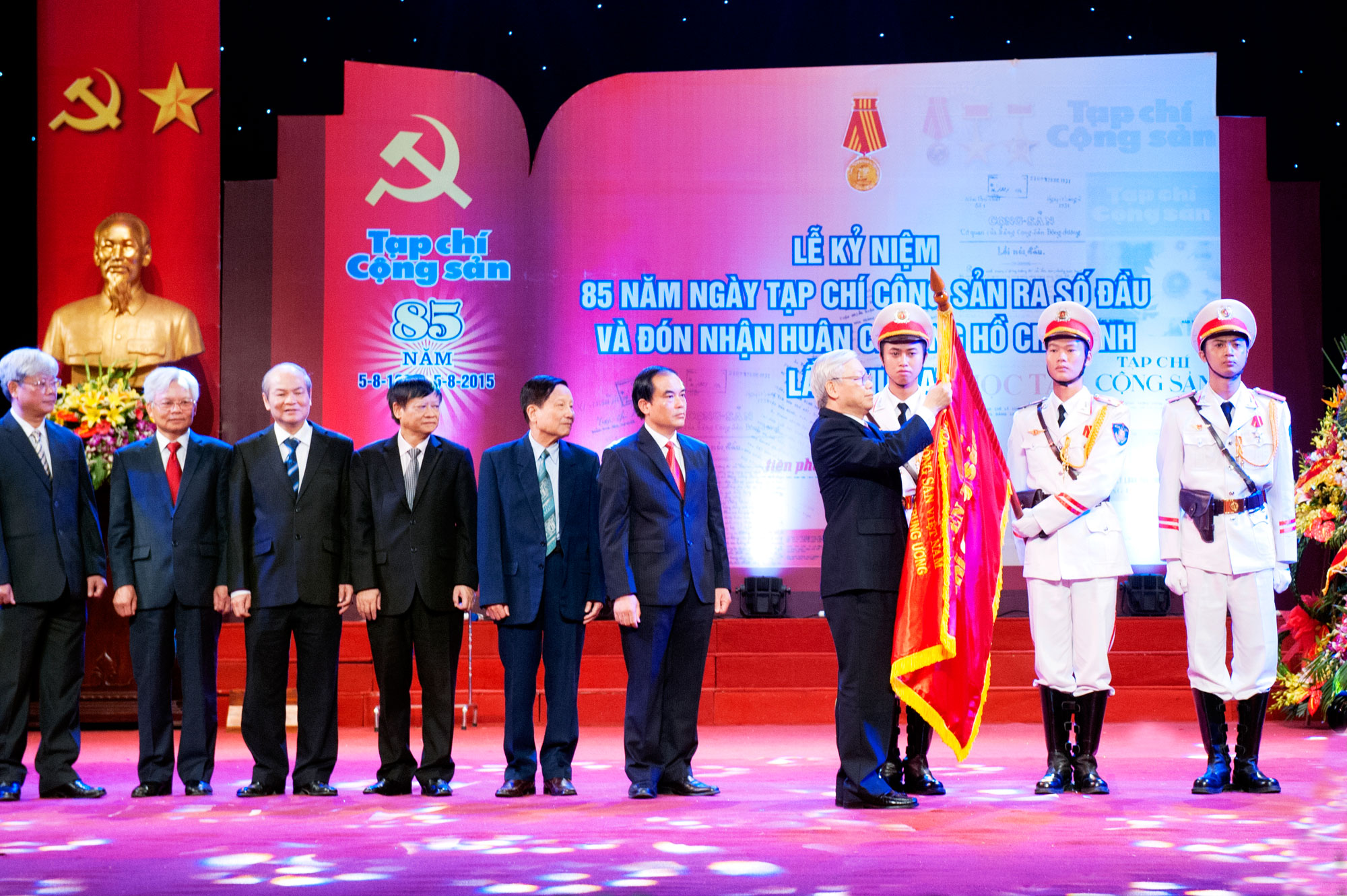 General Secretary Nguyen Phu Trong pinning the Ho Chi Minh Medal on the traditional flag of the Communist Review at the 85th Anniversary of 1st edition and 2nd reception of the Ho Chi Minh Medal, August 5, 2015 _Photo: Communist Review archives
