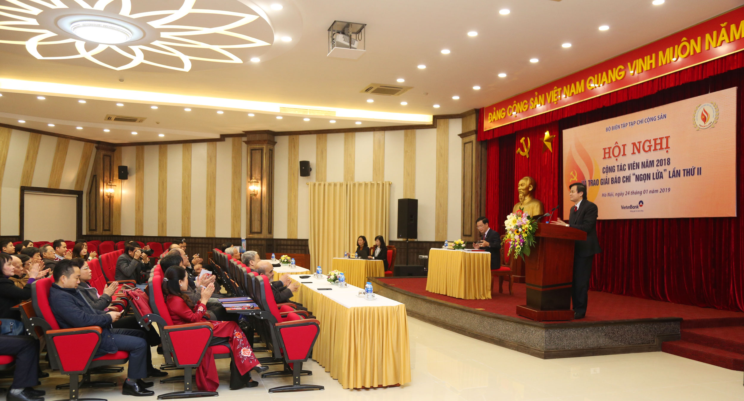 Assoc. Prof., Dr. Doan Minh Huan, Alternate Member of the Party Central Committee, Editor-in-Chief of the Communist Review addressing the 2018 Collaborators Conference and awarding the 2nd Communist Review Press Prize titled "Flame" _Communist Review archives