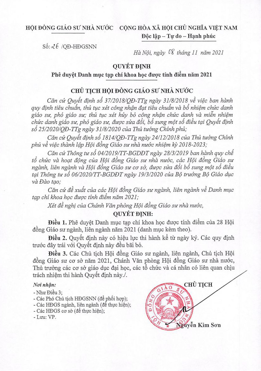 * Quyết định số 26/QĐ-HĐGSNN, ngày 8-11-2021 của Hội đồng Giáo sư nhà nước phê duyệt Danh mục tạp chí khoa học được tính điểm năm 2021: