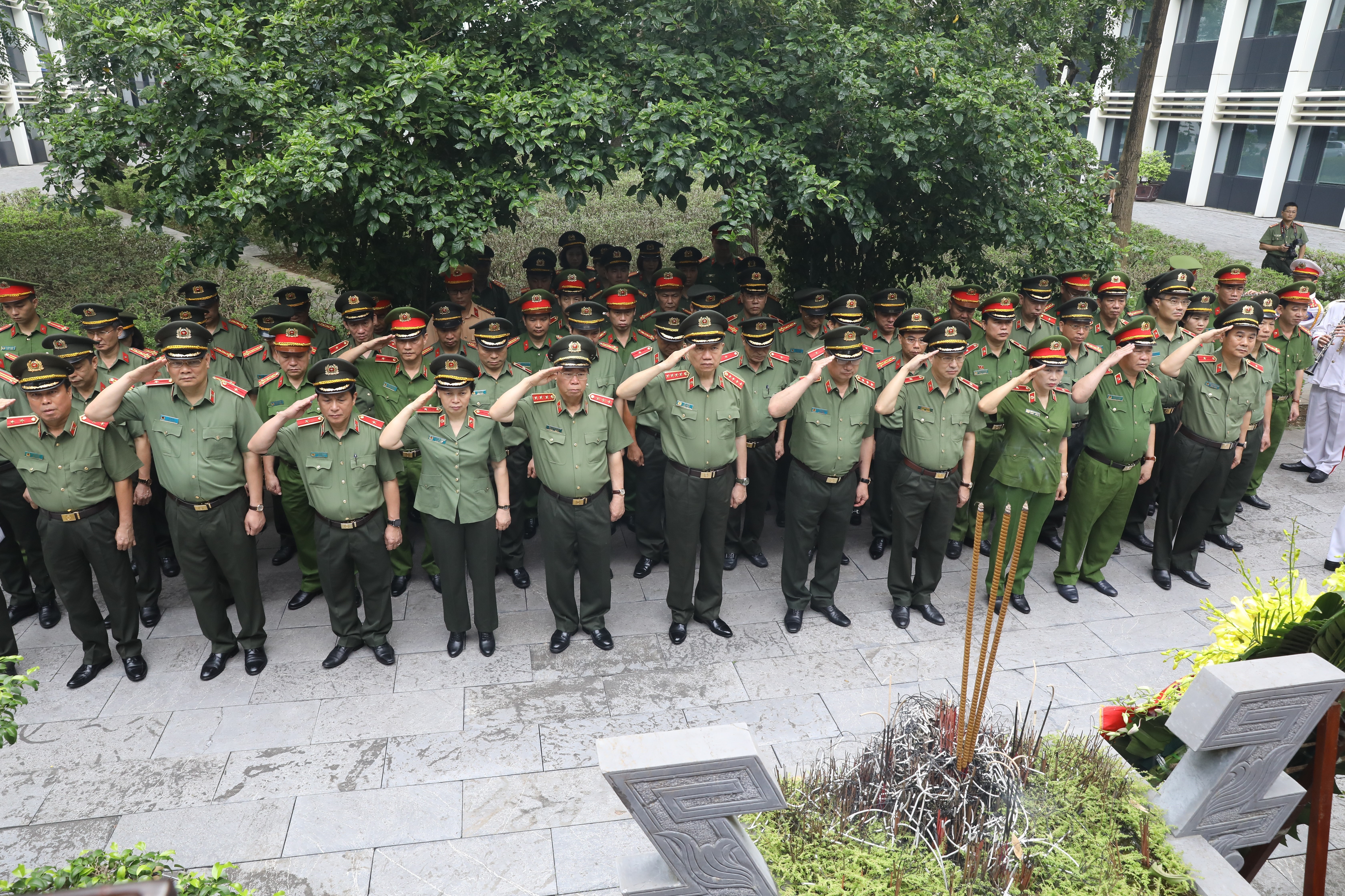 Đại tướng Tô Lâm, Ủy viên Bộ Chính trị, Bí thư Đảng ủy Công an Trung ương, Bộ trưởng Bộ Công an cùng các đại biểu dâng hoa, dâng hương tưởng niệm Chủ tịch Hồ Chí Minh tại Nhà tưởng niệm trong khuôn viên trụ sở Bộ Công an nhân dịp Kỷ niệm 130 năm Ngày sinh Chủ tịch Hồ Chí Minh_Ảnh: TTXVN