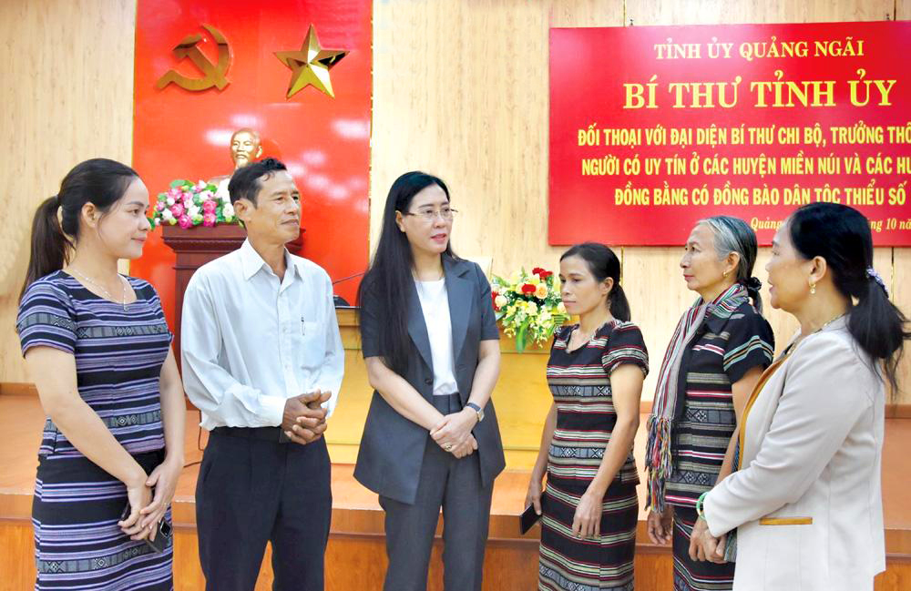Ủy viên Trung ương Đảng, Bí thư Tỉnh ủy Quảng Ngãi Bùi Thị Quỳnh Vân gặp gỡ đối thoại với đại diện bí thư chi bộ, trưởng thôn và người có uy tín ở các huyện miền núi và huyện đồng bằng có đồng bào dân tộc thiểu số_Nguồn: baoquangngai.vn