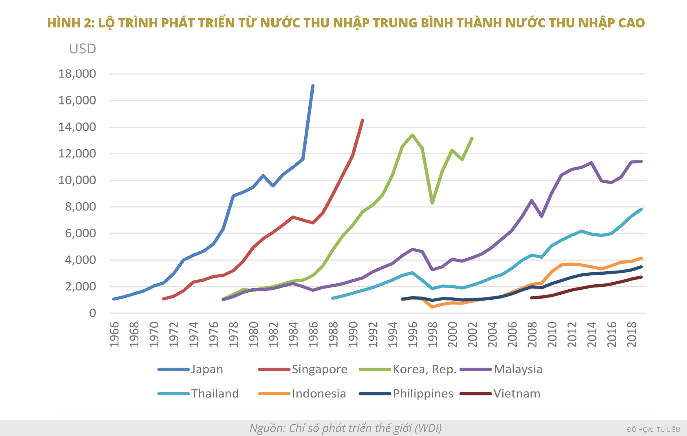Nhìn vào quá trình phát triển của các quốc gia khác nhau trong 60 năm qua, có thể thấy, một số quốc gia thành công trong việc duy trì tăng trưởng liên tục để chuyển đổi từ nước có thu nhập thấp lên nước thu nhập cao (Nhật Bản, Hàn Quốc, Xin-ga-po), trong khi đó, một số quốc gia khác vẫn nằm trong mức thu nhập trung bình, chưa thể lên mức thu nhập cao (Ma-lai-xi-a, Thái Lan, In-đô-nê-xi-a, Phi-líp-pin). Số liệu của WB cho thấy, năm 1966 Nhật Bản mới trở thành nước thu nhập trung bình, Xin-ga-po đạt GDP bình quân đầu người trên 1.000 USD vào năm 1971, Hàn Quốc và Ma-lai-xi-a cùng đạt ngưỡng này vào năm 1977, Thái Lan: năm 1988 và In-đô-nê-xi-a, Phi-líp-pin: năm 1995. Đến năm 2019, GDP bình quân đầu người của các quốc gia này lần lượt là Nhật Bản: 40.248 USD, Xin-ga-po: 65.233 USD, Hàn Quốc: 31.761 USD, Ma-lai-xi-a: 11.414 USD, Thái Lan: 7.808 USD, In-đô-nê-xi-a: 4.135 USD và Phi-líp-pin: 3.485 USD. Như vậy, trong các nước này, chỉ có Nhật Bản, Hàn Quốc, Xin-ga-po trở thành nước thu nhập cao, các nước còn lại vẫn ở trạng thái thu nhập trung bình.