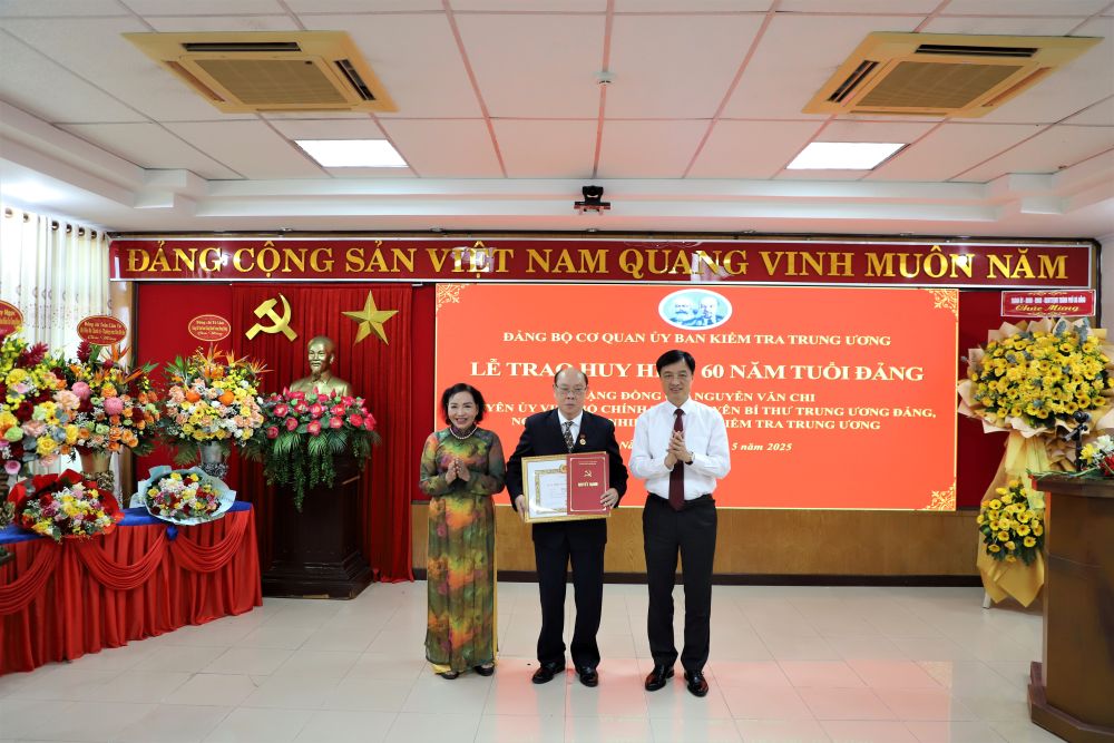 TCCS - Ngày 19-5-2025, Đảng ủy Cơ quan Ủy ban Kiểm tra Trung ương tổ chức Lễ trao Huy hiệu 60 năm tuổi Đảng tặng đồng chí Nguyễn Văn Chi, nguyên Ủy viên Bộ Chính trị, nguyên Bí thư Trung ương Đảng, nguyên Chủ nhiệm Ủy ban Kiểm tra Trung ương.