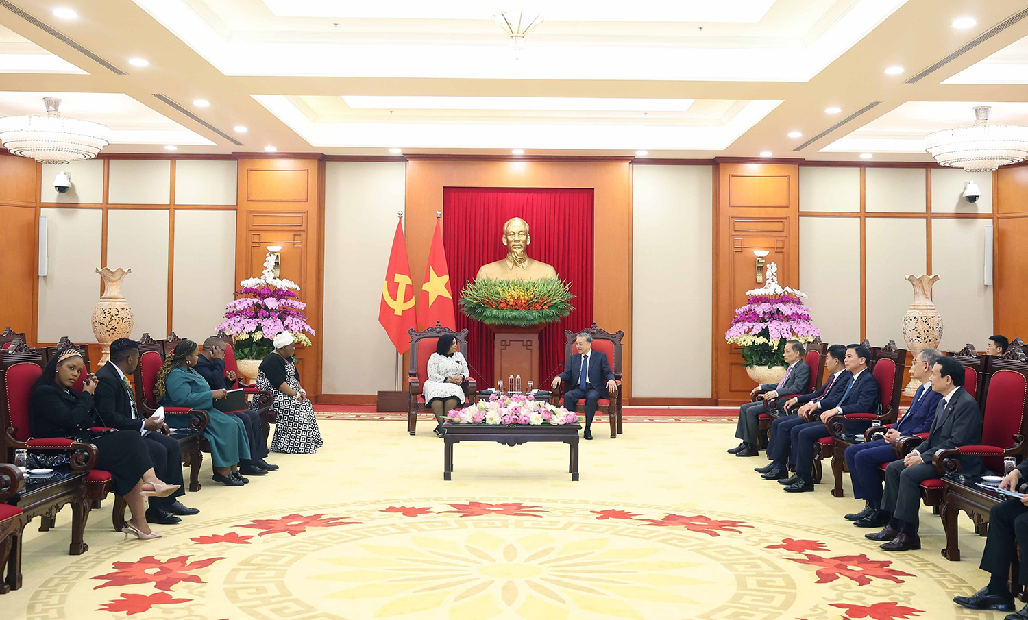 Tổng Bí thư Tô Lâm bày tỏ vui mừng và hoan nghênh Phó Tổng Thư ký thứ nhất Đảng ANC Nomvula Mokonyane dẫn đầu Đoàn đại biểu cấp cao Đảng ANC đến thăm Việt Nam đúng vào dịp diễn ra nhiều sự kiện quan trọng của Việt Nam, đặc biệt là kỷ niệm 50 năm Ngày giải phóng miền Nam, thống nhất đất nước, 135 năm Ngày sinh Chủ tịch Hồ Chí Minh và hướng tới là lễ kỷ niệm 80 năm Ngày Quốc khánh của Việt Nam, thể hiện tình cảm đoàn kết, gắn bó anh em mà Đảng ANC dành cho Đảng, Nhà nước và nhân dân Việt Nam.