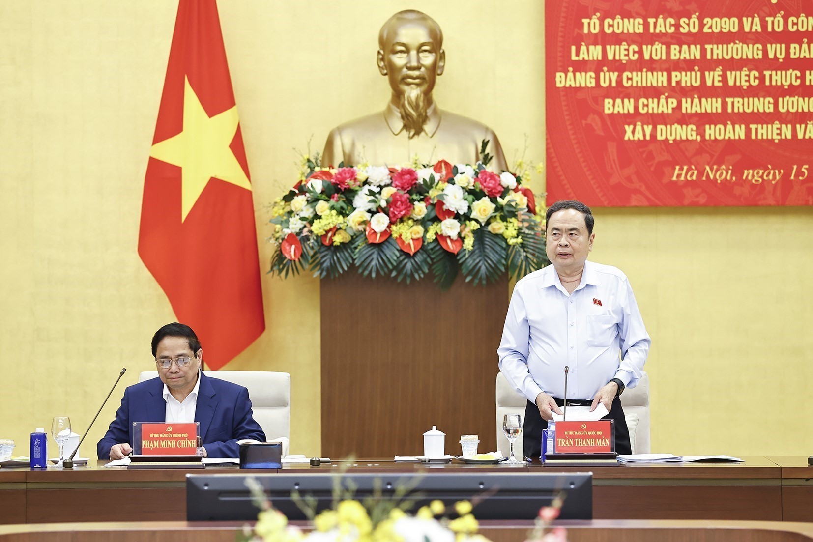TCCS - Ngày 15-7-2025, tại nhà Quốc hội, Tổ công tác số 2090 và Tổ công tác số 2091 của Bộ Chính trị làm việc với Ban Thường vụ Đảng ủy Quốc hội và Ban Thường vụ Đảng ủy Chính phủ về việc thực hiện Nghị quyết Hội nghị Trung ương 11 khóa XIII (Nghị quyết số 60-NQ/TW) gắn với việc xây dựng, hoàn thiện văn kiện, công tác nhân sự. Ủy viên Bộ Chính trị, Bí thư Đảng ủy Chính phủ, Thủ tướng Chính phủ Phạm Minh Chính và Ủy viên Bộ Chính trị, Bí thư Đảng ủy Quốc hội, Chủ tịch Quốc hội Trần Thanh Mẫn chủ trì cuộc làm việc.