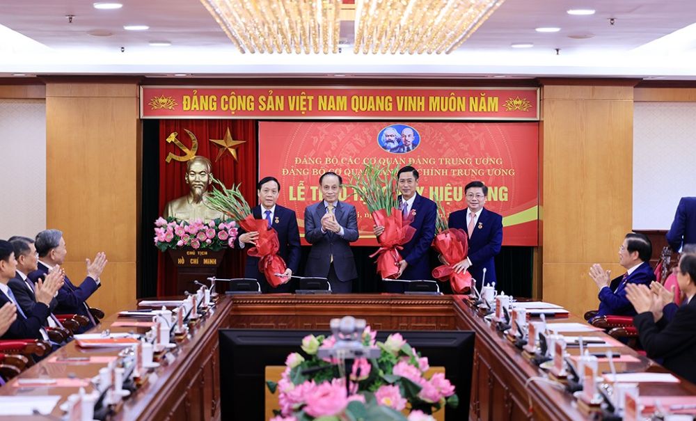 Đồng chí Lê Hoài Trung, Bí thư Trung ương Đảng, Chánh Văn phòng Trung ương Đảng, Phó Bí thư Thường trực Đảng ủy các cơ quan Đảng Trung ương trao huy hiệu và chúc mừng các đồng chí Nguyễn Thanh Hải, Nguyễn Hữu Đông, Nguyễn Văn Mạnh_Ảnh: noichinh.vn