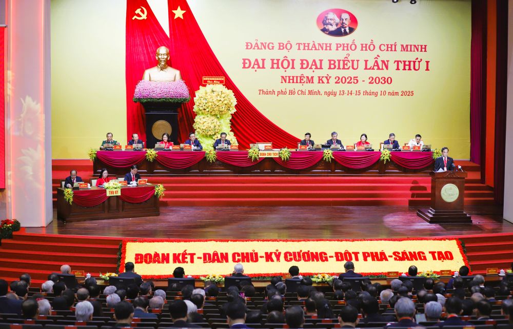 TCCS - Từ ngày 13 đến 15-10-2025, Đại hội đại biểu Đảng bộ Thành phố Hồ Chí Minh lần thứ I, nhiệm kỳ 2025 - 2030 với chủ đề “Xây dựng Đảng bộ và hệ thống chính trị trong sạch, vững mạnh; phát huy sức mạnh đại đoàn kết toàn dân tộc; đột phá phát triển khoa học, công nghệ, đổi mới sáng tạo và kinh tế tư nhân; tăng cường quốc phòng, an ninh, đối ngoại, hội nhập quốc tế; huy động và sử dụng hiệu quả mọi nguồn lực để Thành phố Hồ Chí Minh tiên phong cùng cả nước trong kỷ nguyên mới” diễn ra trọng thể và thành công tốt đẹp, thể hiện tinh thần “Đoàn kết - Dân chủ - Kỷ cương - Đột phá - Sáng tạo”. Đồng chí Tổng Bí thư Tô Lâm dự và chỉ đạo đại hội.