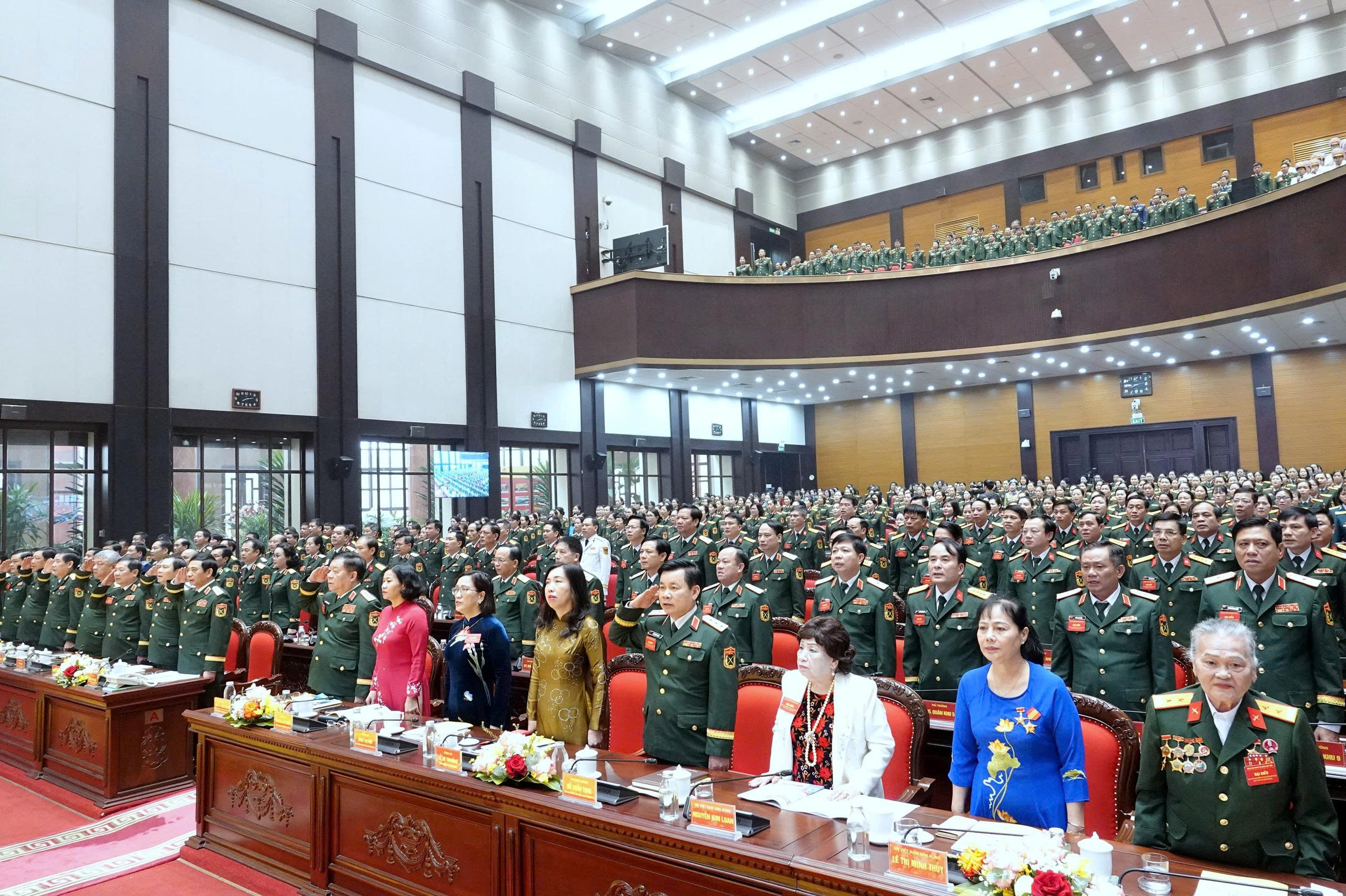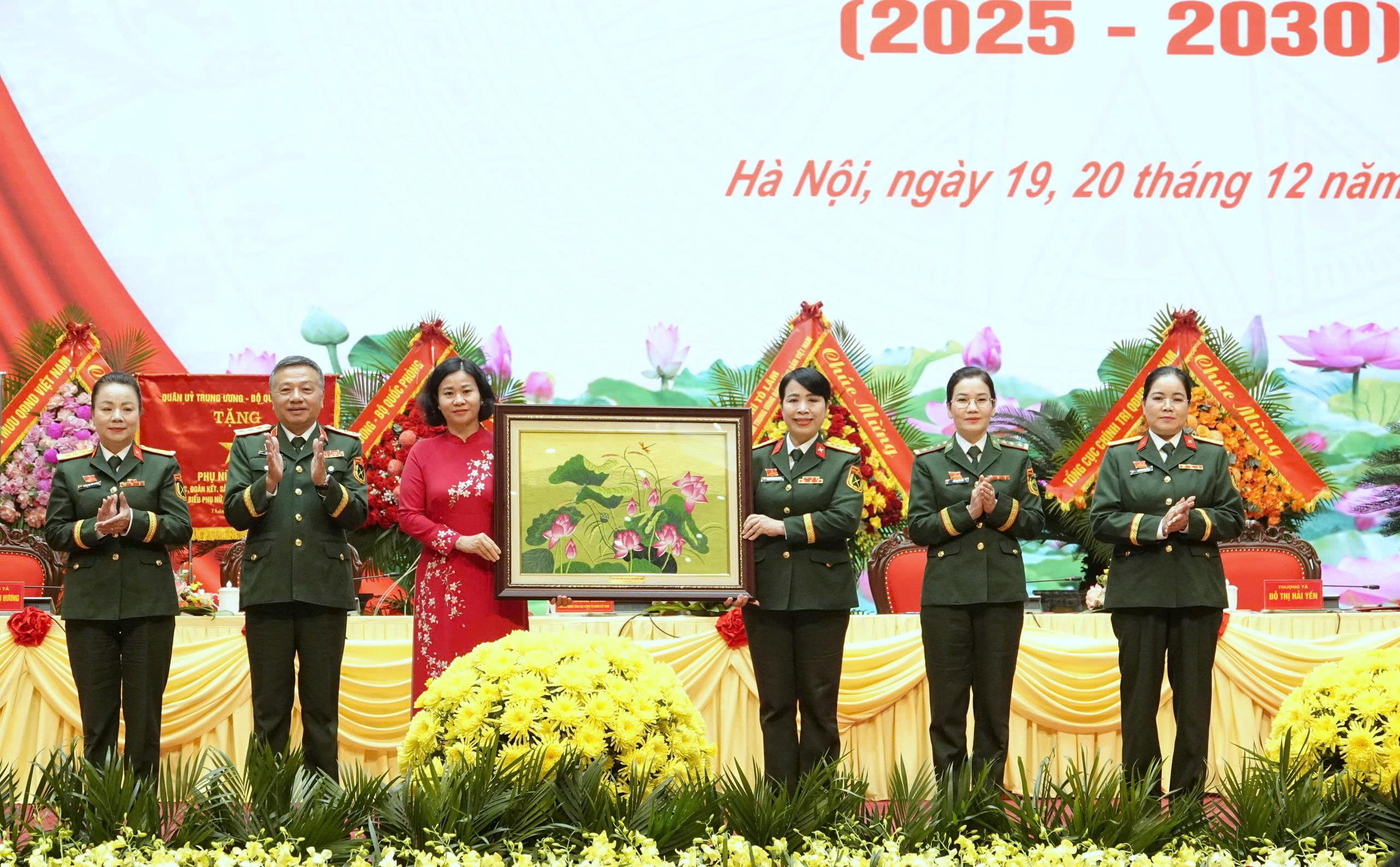 Đại hội đại biểu phụ nữ quân đội lần thứ VIII, nhiệm kỳ 2025 - 2030 vinh dự đón nhận lẵng hoa chúc mừng của đồng chí Tô Lâm, Tổng Bí thư Ban Chấp hành Trung ương Đảng, Bí thư Quân ủy Trung ương và sự tham dự của các đồng chí: Đại tướng Phan Văn Giang, Ủy viên Bộ Chính trị, Phó Bí thư Quân ủy Trung ương, Bộ trưởng Bộ Quốc phòng; Đại tướng Nguyễn Trọng Nghĩa, Ủy viên Bộ Chính trị, Bí thư Trung ương Đảng, Ủy viên Thường vụ Quân ủy Trung ương, Chủ nhiệm Tổng cục Chính trị Quân đội nhân dân Việt Nam.