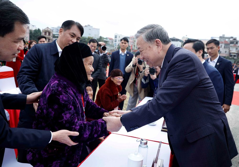Tổng Bí thư Tô Lâm bày tỏ xúc động sâu sắc, được đứng tại nơi này để gặp gỡ đồng bào, các Mẹ Việt Nam Anh hùng, các đồng chí lão thành cách mạng, người có công, người có uy tín, cán bộ, chiến sĩ, các thầy cô giáo và các học sinh; cảm nhận rõ mạch nguồn lịch sử vẫn đang chảy liên tục, sống động trong từng bản làng, từng mái trường, từng con người nơi đây.