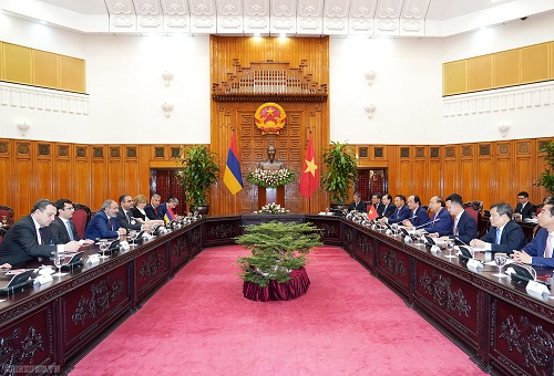 Thủ tướng Nguyễn Xuân Phúc cho biết, Việt Nam luôn yêu mến và trân trọng đất nước và nhân dân Armenia. “Chúng tôi vui mừng nhận thấy Armenia đã vượt qua khó khăn, dưới sự lãnh đạo của ngài Thủ tướng, đã đưa đất nước có bước phát triển đáng mừng... Chúng tôi khẳng định chủ trương nhất quán của lãnh đạo Việt Nam, nhân dân Việt Nam là trân trọng quan hệ truyền thống tốt đẹp giữa hai nước. Chính phủ và nhân dân Việt Nam đánh giá cao chuyến thăm của ngài Thủ tướng và tin rằng hai bên sẽ mở ra chương mới trong quan hệ hợp tác nhiều lĩnh vực mà hai nước cùng có lợi để góp phần xây dựng hai nước chúng ta”, Thủ tướng Nguyễn Xuân Phúc nhấn mạnh.