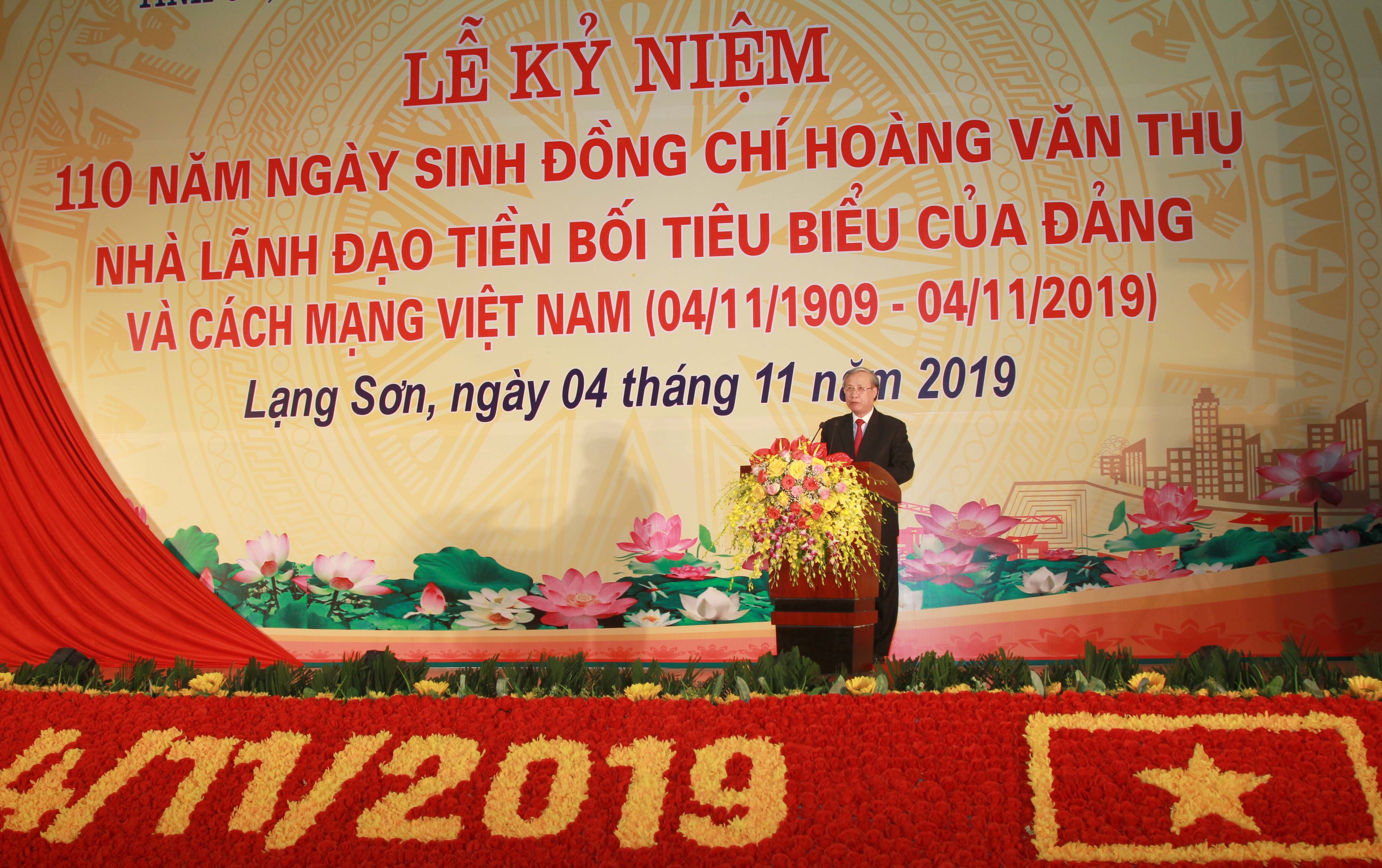 Phát biểu tại lễ kỷ niệm, đồng chí Trần Quốc Vượng, Ủy viên Bộ Chính trị, Thường trực Ban Bí thư nhấn mạnh, Lễ kỷ niệm là dịp để mỗi chúng ta hiểu sâu sắc hơn những cống hiến to lớn của lãnh đạo tiền bối Hoàng Văn Thụ đối với cách mạng Việt Nam nói chung và quê hương Lạng Sơn nói riêng; khơi dậy niềm tự hào, củng cố niềm tin của nhân dân với Đảng; đồng thời, nhắc nhở mỗi chúng ta không ngừng học tập, rèn luyện, trau dồi đạo đức cách mạng, bản lĩnh chính trị theo tấm gương của đồng chí Hoàng Văn Thụ và bao chiến sĩ cộng sản khác, đã cống hiến trọn đời cho sự nghiệp cách mạng của Đảng, của dân tộc và hạnh phúc của nhân dân.