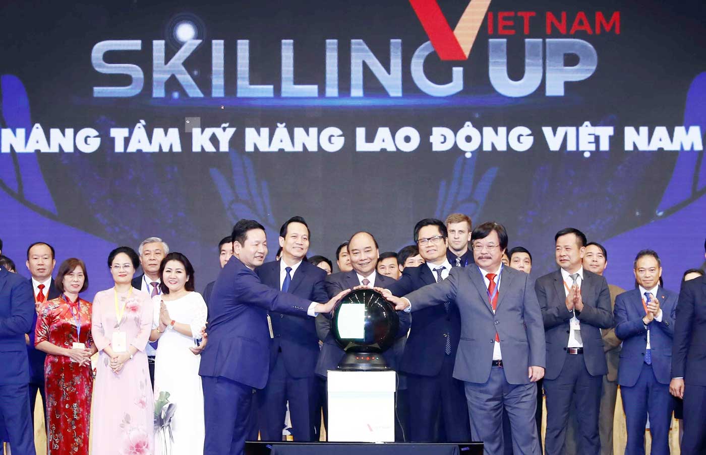 Ủy viên Bộ Chính trị, Thủ tướng Chính phủ Nguyễn Xuân Phúc cùng các đại biểu thực hiện nghi thức “Nhà nước, doanh nghiệp, nhà trường đồng hành đổi mới, nâng cao chất lượng giáo dục nghề nghiệp, nâng tầm kỹ năng lao động Việt Nam”_Ảnh: TTXVN