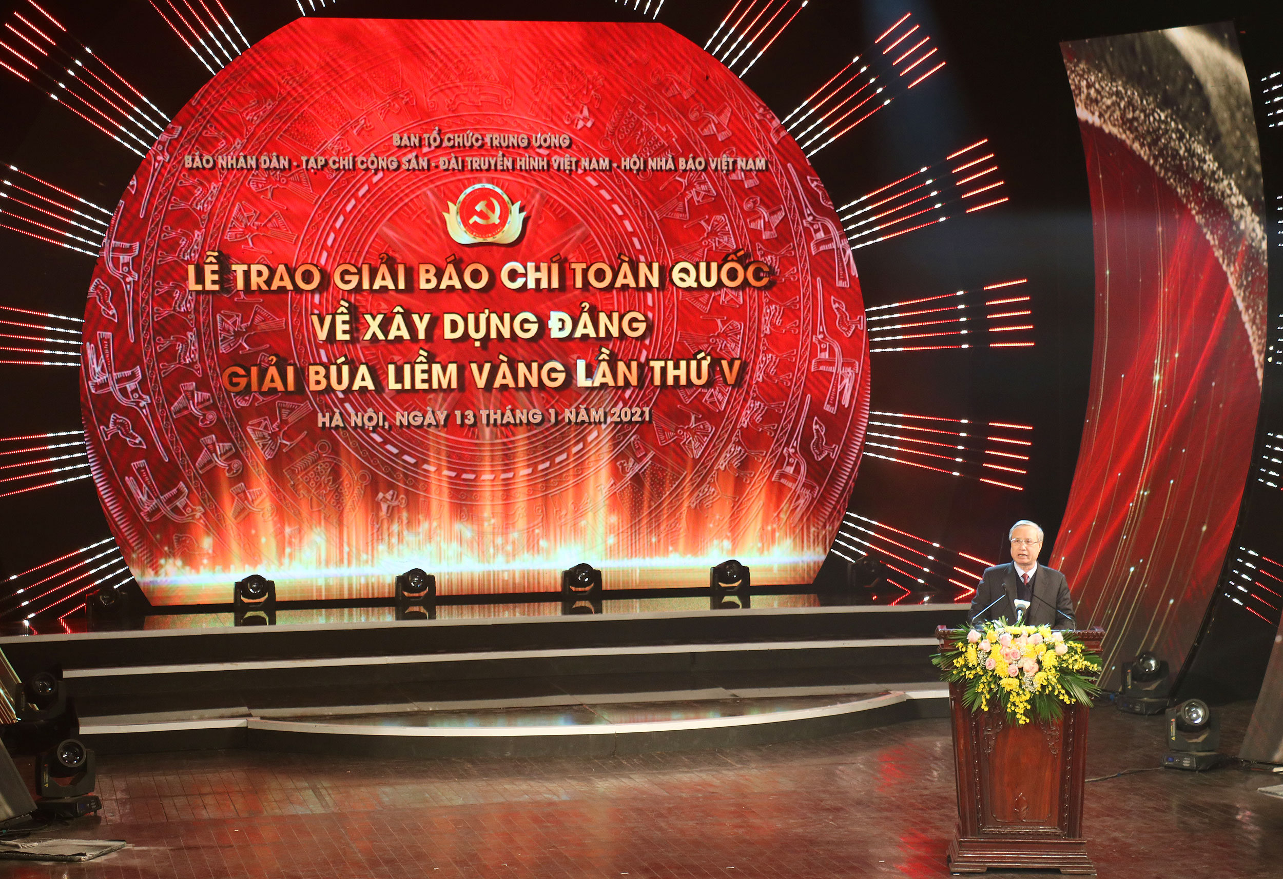 TCCS - Ngày 13-1-2021, tại Nhà hát Lớn Hà Nội, nhân kỷ niệm 91 năm Ngày thành lập Đảng Cộng sản Việt Nam (3-2-1930 - 3-2-2021) và chào mừng Đại hội đại biểu toàn quốc lần thứ XIII của Đảng, Ban Tổ chức Trung ương chủ trì, phối hợp với Tạp chí Cộng sản, Báo Nhân dân, Đài Truyền hình Việt Nam, Hội Nhà báo Việt Nam tổ chức Lễ công bố và trao Giải báo chí toàn quốc về xây dựng Đảng mang tên "Búa liềm vàng" lần thứ V - năm 2020.