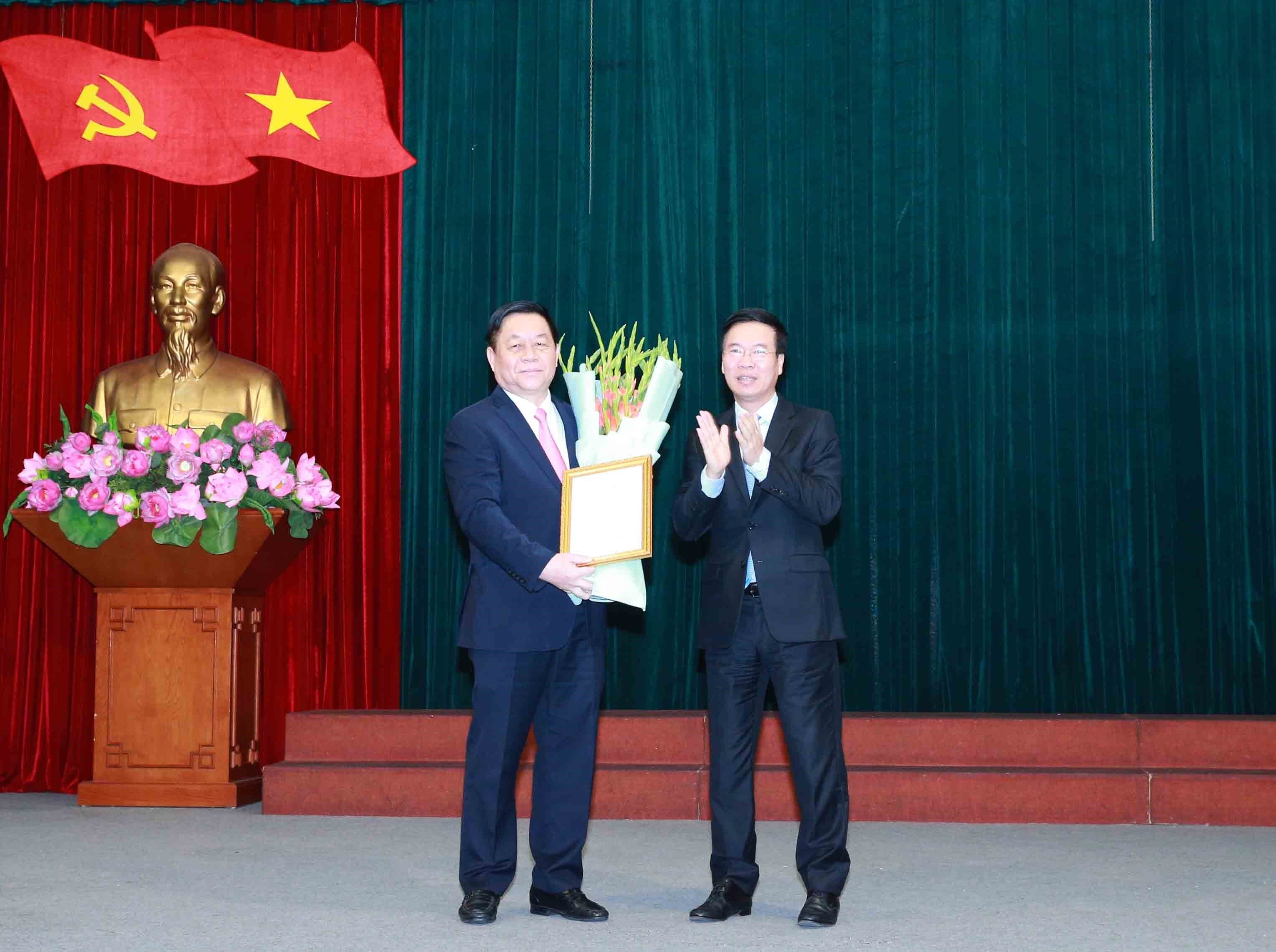 Đồng chí Võ Văn Thưởng, Ủy viên Bộ Chính trị, Thường trực Ban Bí thư trao quyết định và tặng hoa chúc mừng đồng chí Nguyễn Trọng Nghĩa_Ảnh: TTXVN