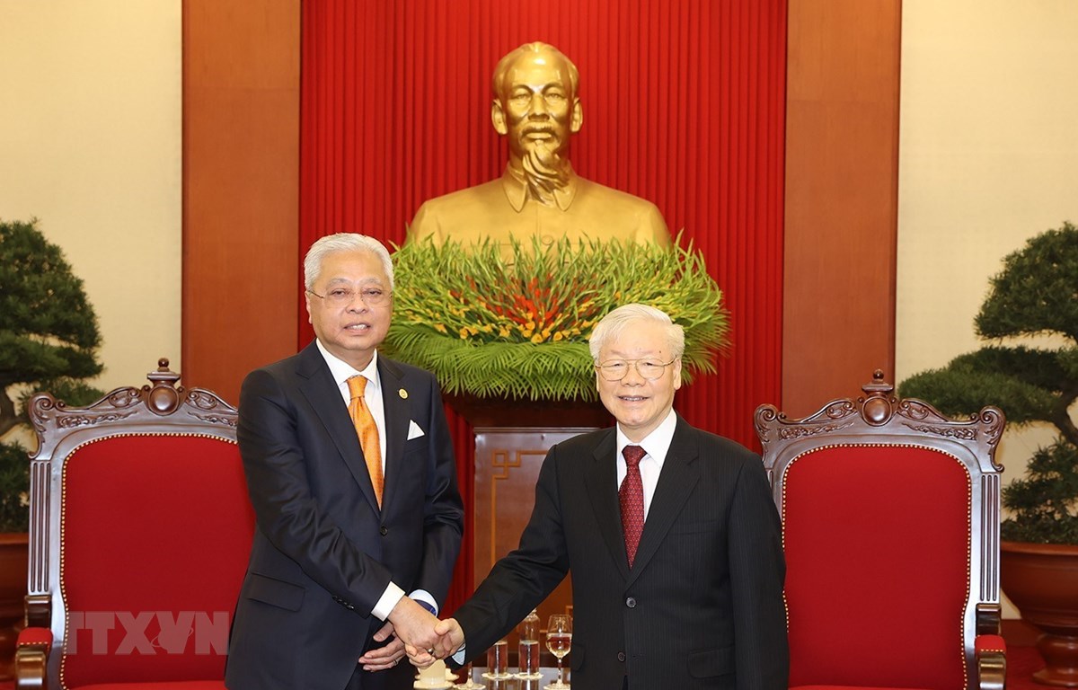 Đến chào xã giao Tổng Bí thư Nguyễn Phú Trọng, Thủ tưởng Malaysia Ismail Sabri Yaakob cảm ơn Tổng Bí thư Nguyễn Phú Trọng đã dành thời gian tiếp, chúc mừng những thành tựu của Việt Nam trong phát triển kinh tế - xã hội thời gian qua, nhất là việc kiểm soát dịch COVID-19, phục hồi phát triển kinh tế. Thủ tướng Ismail Sabri Yaakob thông báo với Tổng Bí thư Nguyễn Phú Trọng về kết quả hội đàm với Thủ tướng Việt Nam Phạm Minh Chính, nhấn mạnh Malaysia coi trọng quan hệ đối tác chiến lược với Việt Nam, mong muốn hai bên đẩy mạnh hợp tác song phương trên các lĩnh vực kinh tế, thương mại, đầu tư và giao lưu nhân dân, bày tỏ sẵn sàng đẩy mạnh hợp tác du lịch và hợp tác biển với Việt Nam nhằm khai thác tiềm năng của hai nước. Thủ tướng Ismail Sabri Yaakob nhất trí tăng cường quan hệ đảng, thông qua trao đổi đoàn, nhất là đoàn cấp cao và giao lưu giữa các tổ chức của đảng nhằm học hỏi, tham khảo kinh nghiệm.