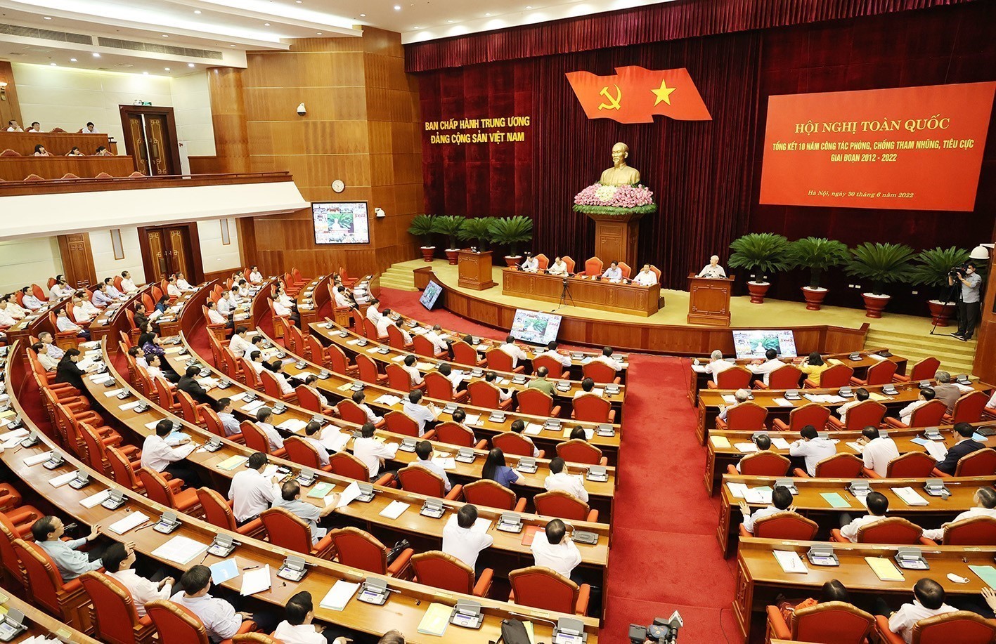 TCCS - Ngày 30-6-2022, tại Hà Nội, Hội nghị toàn quốc Tổng kết 10 năm công tác phòng, chống tham nhũng, tiêu cực giai đoạn 2012 - 2022 đã diễn ra với gần 500 đại biểu dự họp trực tiếp và hơn 80.000 đại biểu dự họp trực tuyến tại hơn 4.000 điểm cầu trong cả nước.
