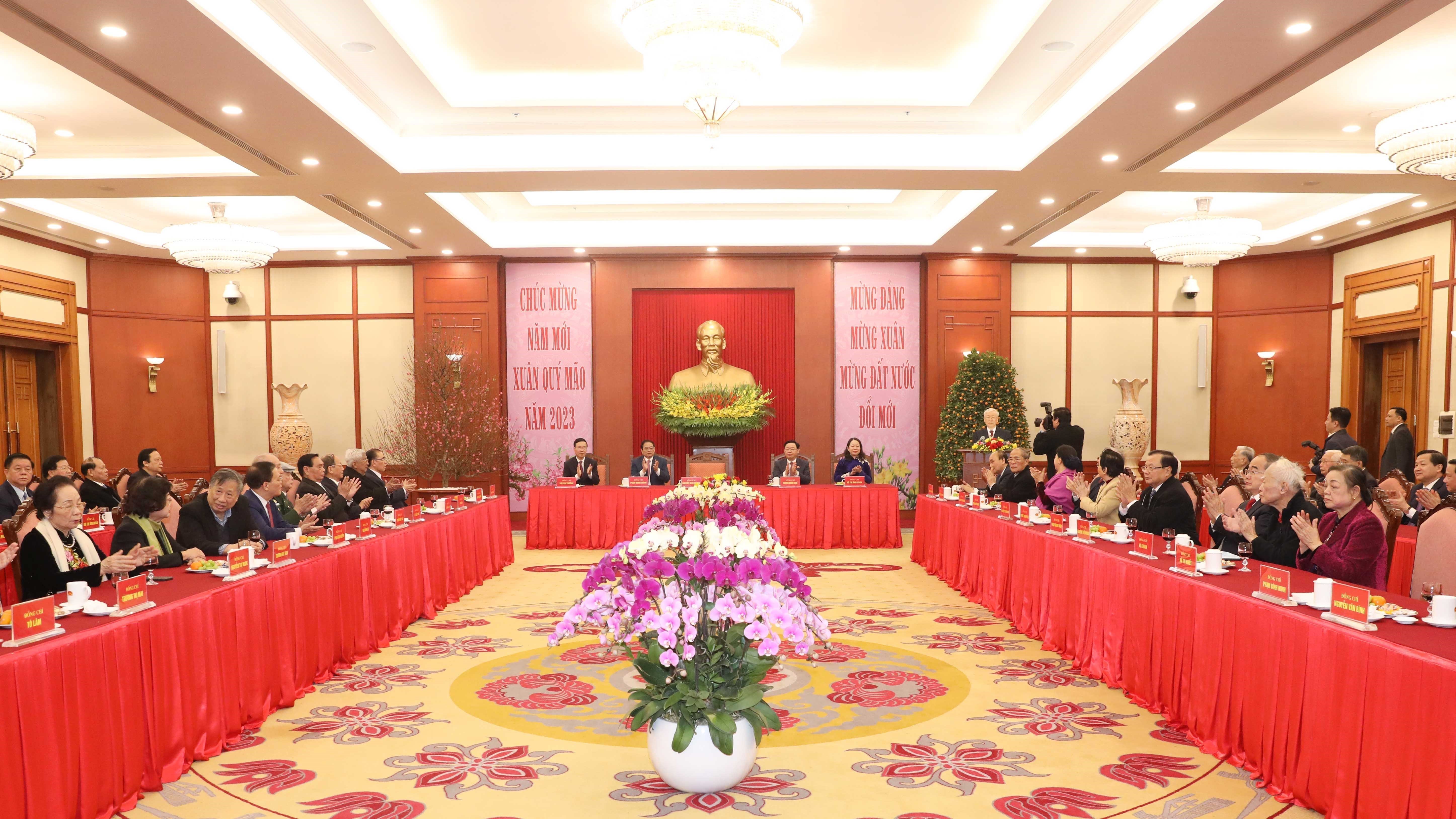 TCCS - Trong không khí cả nước chào đón năm Quý Mão 2023, mừng Đảng Cộng sản Việt Nam 93 tuổi (3-2-1930 - 3-2-2023), ngày 19-1-2023 (tức ngày 28 tháng 12 năm Nhâm Dần), tại trụ sở Trung ương Đảng, Tổng Bí thư Nguyễn Phú Trọng đã gặp mặt, chúc tết các đồng chí lãnh đạo, nguyên lãnh đạo Đảng, Nhà nước, Mặt trận Tổ quốc Việt Nam.