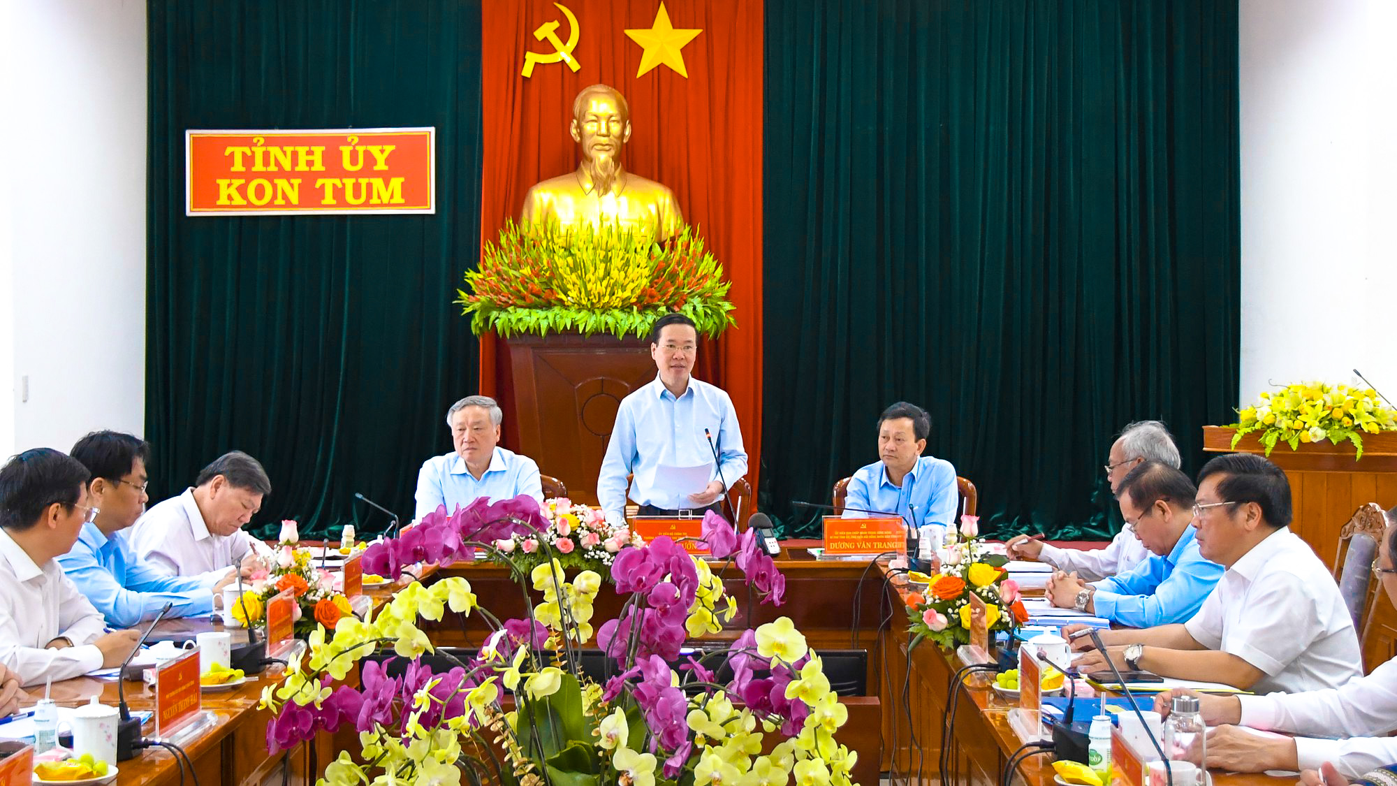 Tại buổi làm việc, đồng chí Võ Văn Thưởng cho rằng, tỉnh Kon Tum đã thực hiện Nghị quyết Đại hội XIII của Đảng và Nghị quyết Đại hội XVI của Đảng bộ tỉnh một cách chủ động, quyết liệt và đạt được nhiều kết quả đáng khích lệ trên những lĩnh vực quan trọng, như nội chính, kiểm tra, giám sát, phòng, chống tham nhũng, tiêu cực,... Tỉnh cũng đã có bước tiến bộ trong công tác sắp xếp, tinh gọn hệ thống chính trị; các khâu trong công tác phát triển cán bộ ngày càng được quan tâm, chú trọng; hoạt động của Mặt trận Tổ quốc và các tổ chức chính trị - xã hội có nhiều đổi mới, phù hợp với bối cảnh, tình hình mới trong nước cũng như quốc tế. Bên cạnh đó, dù có xuất phát điểm thấp, nhưng nền kinh tế của tỉnh Kon Tum có nhiều chuyển biến tích cực. Tính đến năm 2022, tỉnh Kon Tum đạt tổng thu ngân sách khoảng 4.000 tỷ đồng; mức tăng trưởng bình quân chung so với cả nước có nhiều cải thiện, người dân có mức thu nhập tốt hơn; đồng thời, tỉnh cũng chú trọng giữ vững sự an ninh, an toàn ở khu vực biên giới, tạo mối quan hệ tốt với các nước bạn Lào và Campuchia nhằm bảo vệ vững chắc nền tảng cho sự phát triển bền vững trong tỉnh.