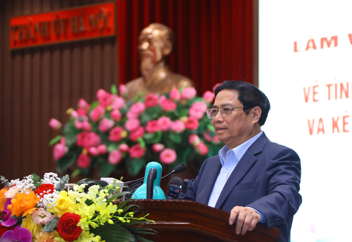 Về nhiệm vụ, giải pháp trọng tâm thời gian tới, trên cơ sở phân tích tình hình, quán triệt quan điểm trong lãnh đạo, chỉ đạo, điều hành, Thủ tướng Chính phủ Phạm Minh Chính yêu cầu thành phố Hà Nội tiếp tục quán triệt, cụ thể hóa Nghị quyết số 30-NQ/TW của Bộ Chính trị về phát triển kinh tế - xã hội, bảo đảm quốc phòng, an ninh vùng đồng bằng sông Hồng; Nghị quyết số 15-NQ/TW của Bộ Chính trị về phương hướng, nhiệm vụ phát triển thành phố Hà Nội đến năm 2030, tầm nhìn đến năm 2045; Nghị quyết số 01/NQ-CP của Chính phủ và nghị quyết của Thành ủy, Hội đồng nhân dân thành phố, phấn đấu hoàn thành vượt mức các mục tiêu, nhiệm vụ đề ra cho năm 2023, tạo nền tảng vững chắc cho những năm tiếp theo.