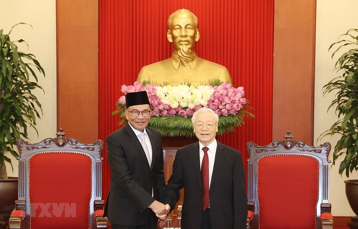 Tại buổi tiếp Thủ tướng Anwar Ibrahim, Tổng Bí thư Nguyễn Phú Trọng hoan nghênh Thủ tướng Anwar Ibrahim và Đoàn đại biểu cấp cao Malaysia thăm chính thức Việt Nam. Tổng Bí thư Nguyễn Phú Trọng nhắc lại những kỷ niệm tốt đẹp trong chuyến thăm trước đây tới Malaysia, đánh giá cao sự phát triển mạnh mẽ và toàn diện của hợp tác giữa hai nước. Tổng Bí thư nhấn mạnh, Việt Nam và Malaysia là hai nước láng giềng thân thiết ở Đông Nam Á, cùng là thành viên ASEAN, chia sẻ quan điểm trên nhiều vấn đề quốc tế quan trọng, nhiều sự tương đồng về văn hóa, lịch sử, nhiều người dân Việt Nam đang sinh sống, học tập ở Malaysia. Tổng Bí thư cảm ơn tình cảm của ngài Thủ tướng đối với Chủ tịch Hồ Chí Minh và những phát biểu tốt đẹp của Thủ tướng Malaysia về đất nước, con người, sự phát triển mọi mặt của Việt Nam cũng như những kết quả quan trọng đạt được trong quản lý đất nước, phòng, chống tham nhũng, tiêu cực. Tổng Bí thư Nguyễn Phú Trọng trao đổi về những thành tựu to lớn, toàn diện mà Việt Nam phấn đấu đạt được, tạo dựng cơ đồ, tiềm lực, vị thế, uy tín quốc tế như ngày nay.