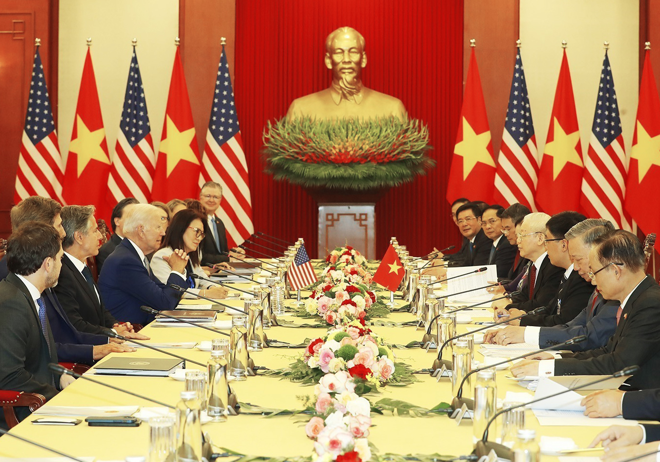 Tổng Bí thư Nguyễn Phú Trọng nhiệt liệt chào mừng, đánh giá cao Tổng thống Joe Biden thăm Việt Nam đúng vào dịp hai nước kỷ niệm 10 năm xác lập quan hệ đối tác toàn diện. Chuyến thăm có ý nghĩa đặc biệt, là dịp để lãnh đạo hai nước trao đổi về quan hệ hai nước và các vấn đề quốc tế vì lợi ích của nhân dân hai nước, đóng góp vào hòa bình, hợp tác, phát triển bền vững ở khu vực và thế giới. Tổng Bí thư Nguyễn Phú Trọng nhắc lại những kỷ niệm tốt đẹp về cuộc trao đổi chân tình với ngài Joe Biden khi Tổng Bí thư thăm Hoa Kỳ hồi tháng 7-2015, đánh giá cao những ý kiến trao đổi giữa hai nhà lãnh đạo trong thời gian qua và cảm ơn Tổng thống Joe Biden vào tháng 6-2023 đã gửi thư mời Tổng Bí thư Nguyễn Phú Trọng sớm thăm lại Hoa Kỳ.
