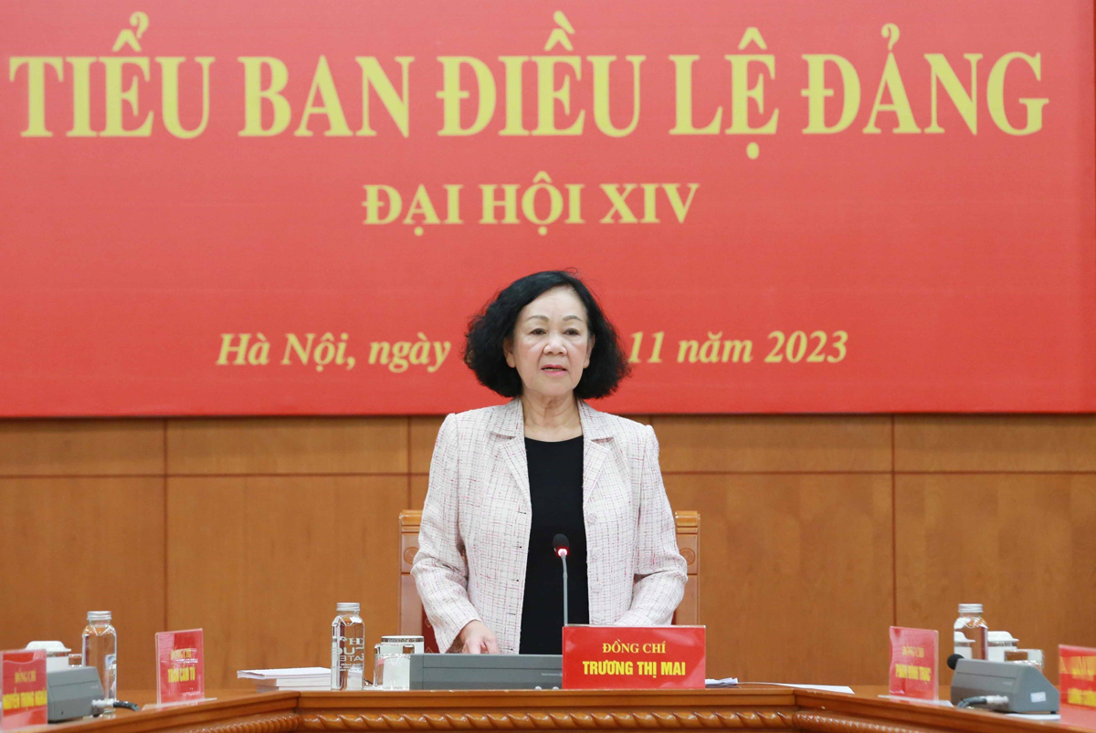 Tại phiên họp, Thường trực Ban Bí thư Trương Thị Mai nêu rõ, Tiểu ban Điều lệ Đảng Đại hội đại biểu toàn quốc lần thứ XIV được thành lập theo Quyết định số 128, do Tổng Bí thư Nguyễn Phú Trọng ký ngày 16-10-2023. Tiểu ban Điều lệ Đảng để phục vụ cho Đại hội đại biểu toàn quốc lần thứ XIV của Đảng gồm 35 thành viên, trong đó có 8 Ủy viên Bộ Chính trị, Bí thư Trung ương Đảng; Phó Chủ tịch Quốc hội; Tổng Thư ký Ủy ban Trung ương Mặt trận Tổ quốc Việt Nam; các Ủy viên Trung ương Đảng, Ủy viên dự khuyết Trung ương Đảng; trong đó có 8 bí thư tỉnh ủy, thành ủy là những người có kinh nghiệm trong công tác xây dựng Đảng.