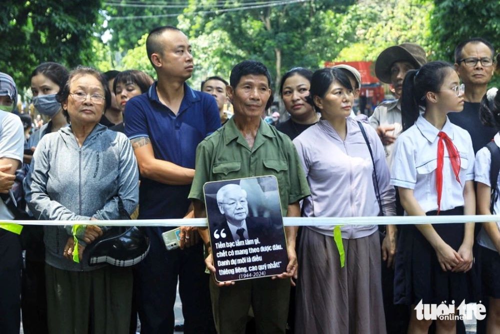 Trong dòng người đứng đợi để tiễn biệt Tổng Bí thư Nguyễn Phú Trọng, nhiều người dân còn mang theo di ảnh bày tỏ lòng thành kính, tưởng nhớ Tổng Bí thư Nguyễn Phú Trọng.