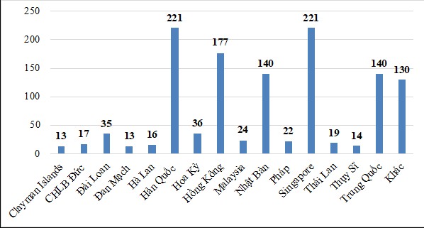 Theo quốc gia chủ đầu tư, tính lũy kế đến hết năm 2024, Việt Nam đã thu hút được 55 quốc gia và vùng lãnh thổ đầu tư vào lĩnh vực logistics. Trong đó, 5 quốc gia có số dự án đầu tư vào lĩnh vực logistics tại Việt Nam lớn nhất bao gồm: Hàn Quốc và Singapore đều đầu tư 221 dự án, cùng chiếm tỷ trọng lớn nhất với 17,9%; Hồng Kông (Trung Quốc) với 177 dự án, chiếm 14,3%; Nhật bản và Trung Quốc đều đầu tư 140 dự án và cùng chiếm 11,3%; riêng Trung Quốc tăng trưởng mạnh số dự án đầu tư vào lĩnh vực logistics tại Việt Nam với 37 dự án chỉ trong năm 2024 (Hình 2).