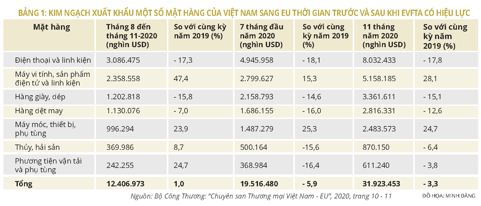 Ngay sau khi EVFTA có hiệu lực từ đầu tháng 8-2020, đến tháng 11-2020, kim ngạch xuất khẩu hàng hóa của Việt Nam sang EU đạt 12,4 tỷ USD, tăng 1% so với cùng kỳ năm 2019 và cải thiện so với mức giảm 5,9% trong 7 tháng đầu năm 2020. Nhờ đó, tổng kim ngạch xuất khẩu của Việt Nam sang EU sau giai đoạn sụt giảm mạnh trong 7 tháng đầu năm 2020 do tác động của đại dịch COVID-19 đã dần thu hẹp kể từ tháng 8-2020 và tính chung cả năm 2020, kim ngạch xuất khẩu của Việt Nam sang EU chỉ giảm trên 3,5%.