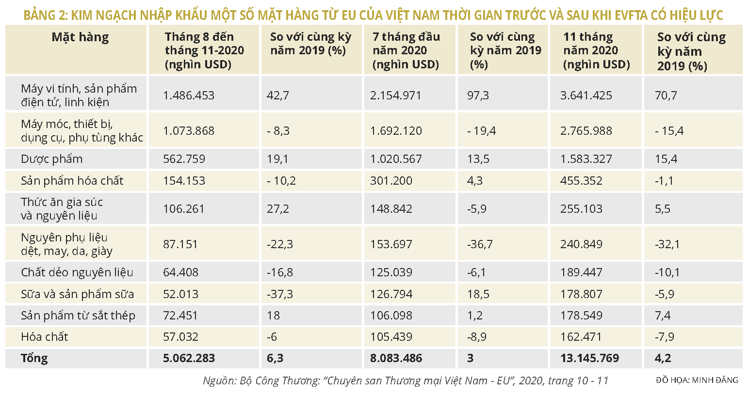 Đối với kim ngạch nhập khẩu từ EU, trong 4 tháng sau khi EVFTA có hiệu lực, kim ngạch nhập khẩu hàng hóa của Việt Nam từ EU đạt 5,06 tỷ USD, tăng 6,3% so với cùng kỳ năm 2019, cao hơn so với mức tăng 3% trong 7 tháng đầu năm 2020 (trước khi EVFTA có hiệu lực). Trong 4 tháng sau khi EVFTA có hiệu lực, nhập khẩu một số mặt hàng từ thị trường EU tăng mạnh so với cùng kỳ năm 2019, như thức ăn gia súc và nguyên liệu; sản phẩm từ sắt thép; chế phẩm thực phẩm khác; thuốc trừ sâu và nguyên liệu; kim loại thường. Trong khi nhập khẩu nhiều mặt hàng vẫn giảm mạnh so với cùng kỳ năm 2019. Cụ thể, nhập khẩu máy móc, thiết bị, dụng cụ, phụ tùng từ thị trường EU mặc dù vẫn giảm, nhưng mức giảm đã chậm lại, với mức giảm trong giai đoạn từ tháng 8 đến tháng 11-2020 là 8,3%, thấp hơn so với mức giảm 19,4% trong 7 tháng đầu năm 2020(11).