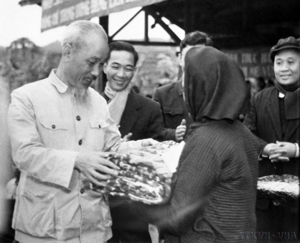 Đồng bào các dân tộc Pác Bó (Cao Bằng) tặng Chủ tịch Hồ Chí Minh hoa và vải thổ cẩm, loại vải đẹp do đồng bào dệt (ngày 20-2-1961) Ảnh: TTXVN