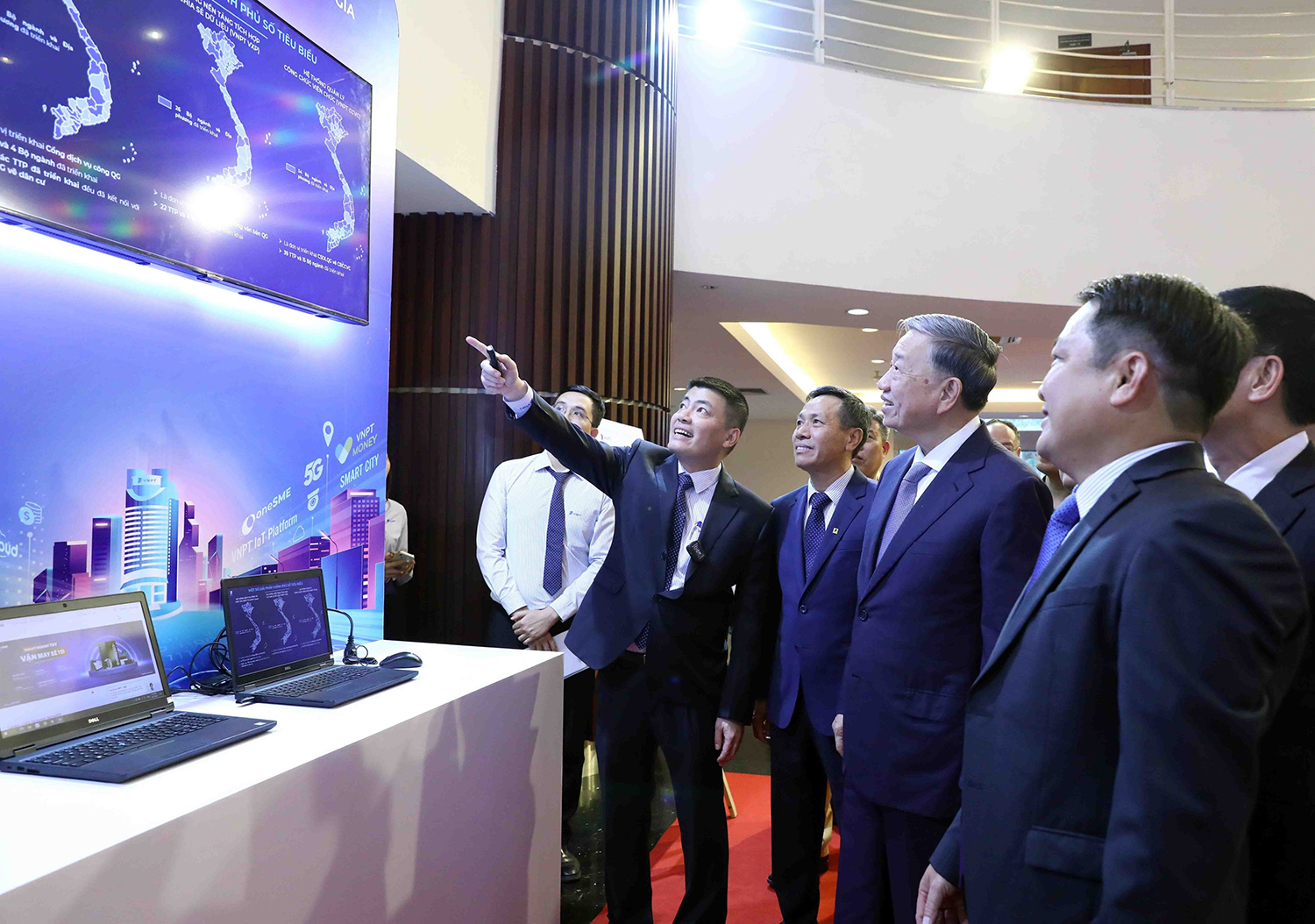 Đại tướng Tô Lâm, Ủy viên Bộ Chính trị, Bộ trưởng Bộ Công an tham quan gian trưng bày các thành tựu về công nghệ chuyển đổi số của Tập đoàn Bưu chính viễn thông Việt Nam, ngày 27-4-2023 _Ảnh: TTXVN