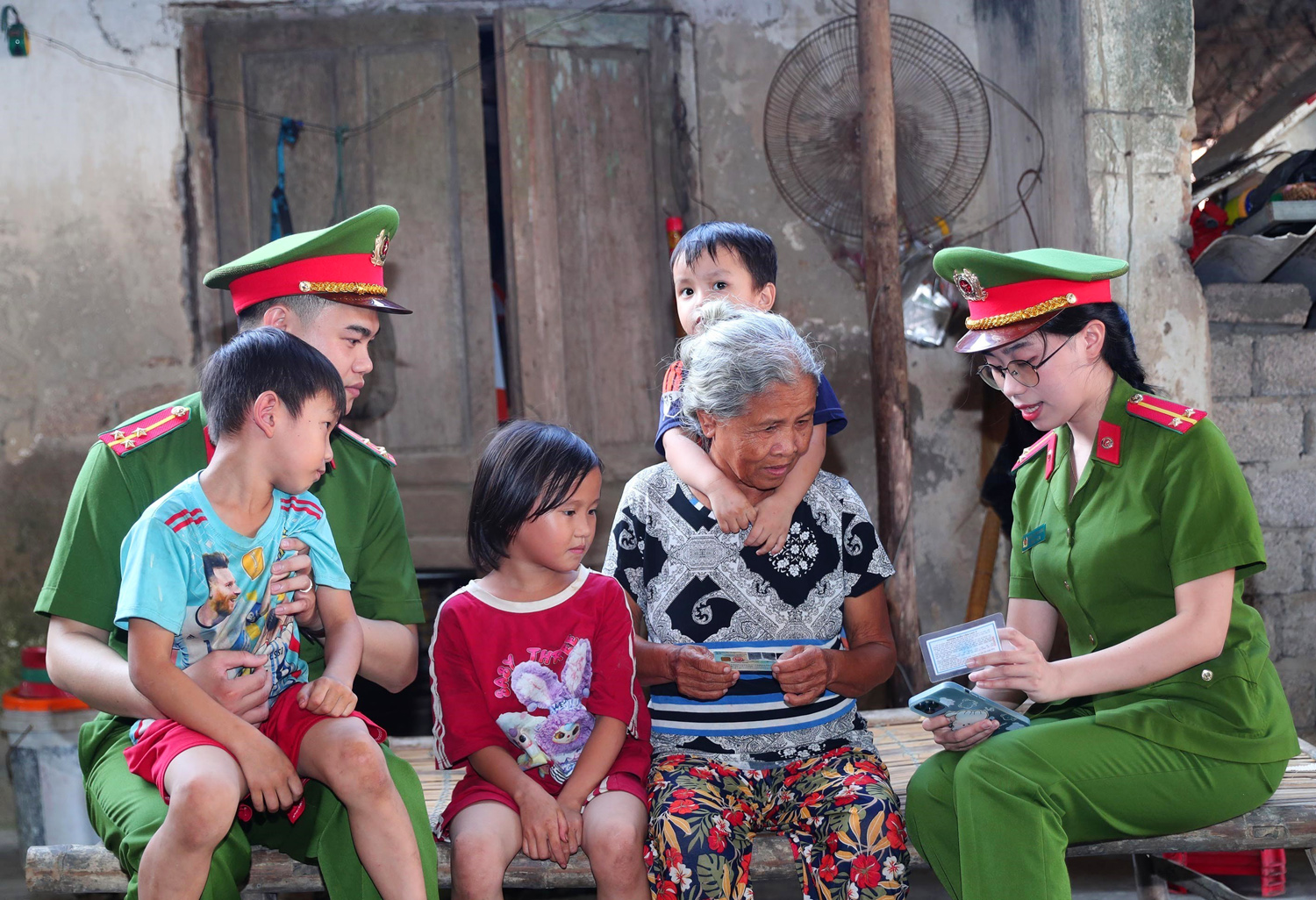 Cán bộ công an xã đến tận hộ gia đình tuyên truyền, hướng dẫn người dân thực hiện các thủ tục hành chính trên môi trường điện tử _Ảnh: TTXVN