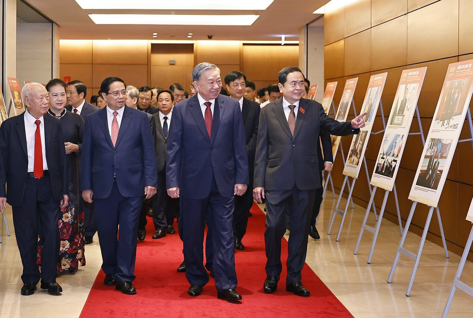 Tổng Bí thư Tô Lâm và các đồng chí lãnh đạo, nguyên lãnh đạo Đảng, Nhà nước xem triển lãm ảnh "Đảng bộ Quốc hội: Đoàn kết - Dân chủ - Kỷ cương - Đột phá" tại Đại hội đại biểu Đảng bộ Quốc hội lần thứ I, nhiệm kỳ 2025 - 2030 _Ảnh: TTXVN