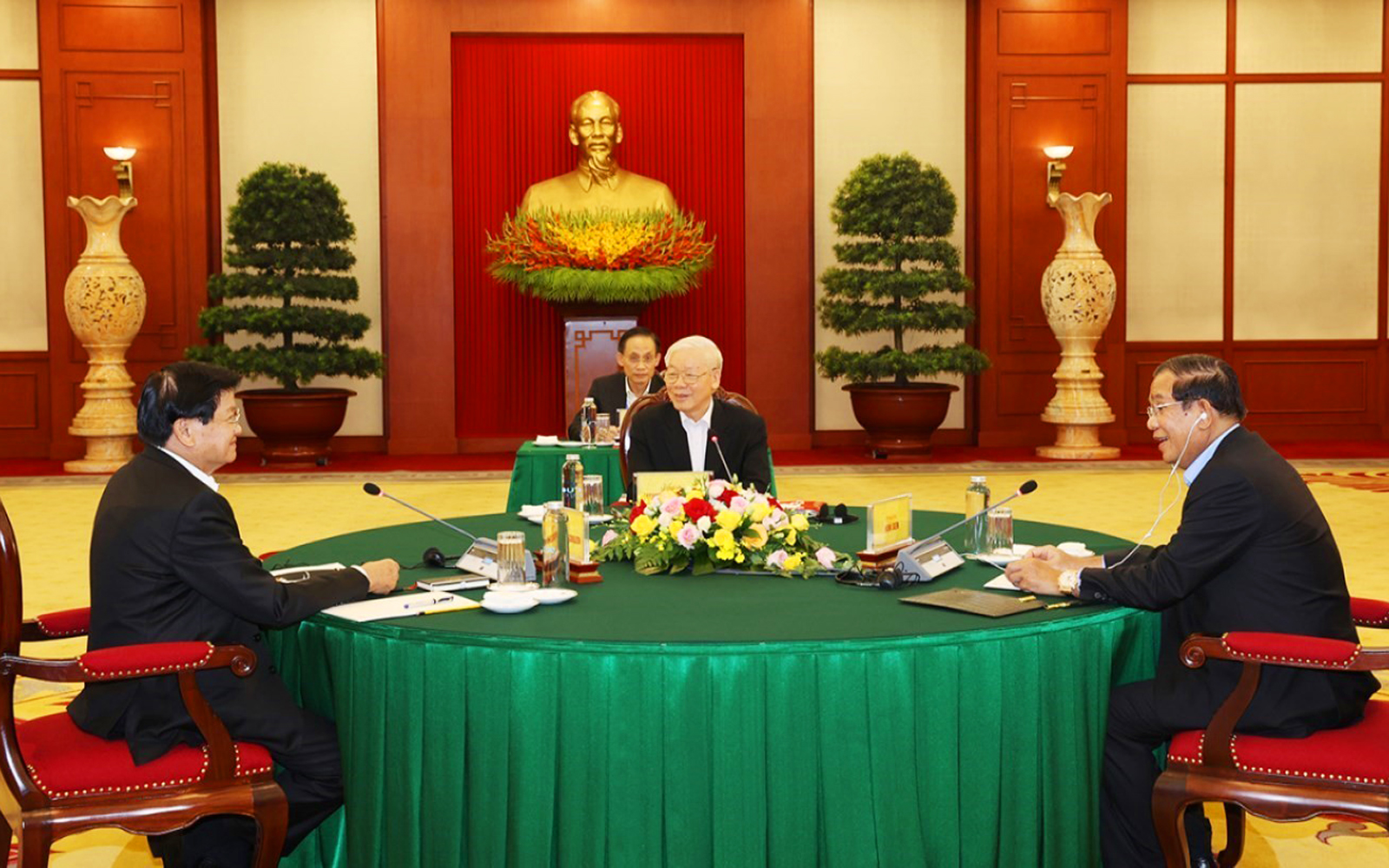 Tổng Bí thư Nguyễn Phú Trọng cùng Tổng Bí thư, Chủ tịch nước Lào Thongloun Sisoulith và Chủ tịch Đảng Nhân dân Campuchia, Thủ tướng Chính phủ Vương quốc Campuchia Hun Sen tại Cuộc gặp cấp cao Việt Nam - Lào - Campuchia _Ảnh: TTXVN