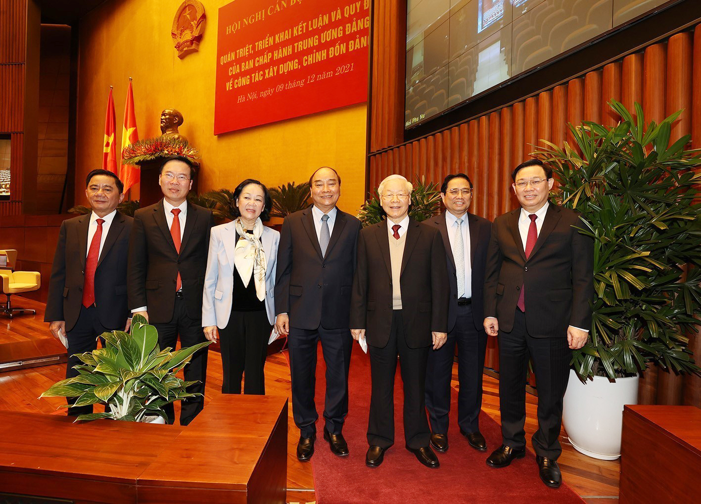 Tổng Bí thư Nguyễn Phú Trọng cùng các đồng chí lãnh đạo Đảng, Nhà nước dự Hội nghị cán bộ toàn quốc về công tác xây dựng, chỉnh đốn Đảng _Ảnh: TTXVN
